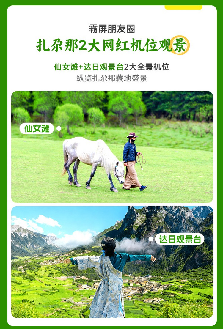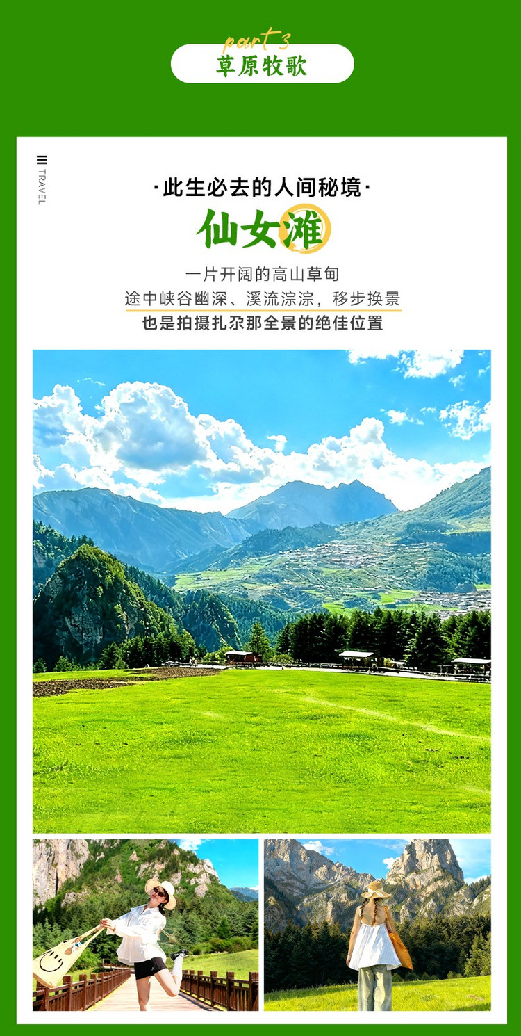 早餐后我们从酒店出发,开始穿越约100公里的【江迭公路】,一路欣赏沿途震撼而又浪漫的绝美风光。途径五彩斑斓经幡装饰的长达600米的隧道,抵达【达日观景台】(160km,车程约5小时,游玩30分钟),这里是看扎尕那全景的醉佳位置,俯瞰整个达日村和后面奇幻岩壁的全貌。还可看到四座雪峰如巨兽蹲伏,将村落、草甸、溪流揽入怀中。在群山环绕之中,有一处大片的草坪,平整的木栈道,那就是【仙女滩】(6km,车程约0.5小时,游玩2-3小时),在这里可以一览无余的饱览整个扎尕那山峰的全景。这里也是《中国国家地理》笔下 “此生必去的人间秘境”无论是沿着木栈道漫步,还是骑马穿行其间,都能感受到大自然的宁静与壮美。