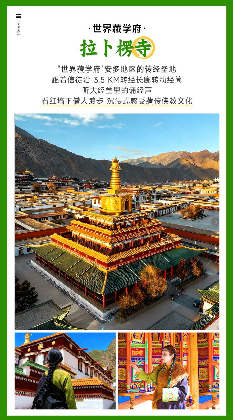 午后前往世界藏学府的朝圣之地【拉卜楞寺】(30km,车程约30分钟,游览2小时)。金顶红墙的建筑群在阳光下熠熠生辉,1700多个转经筒组成3.5公里的世界级转经长廊。在贡唐宝塔俯瞰整个寺院建筑群时,会被信仰与智慧交织的恢弘气象深深震撼。
