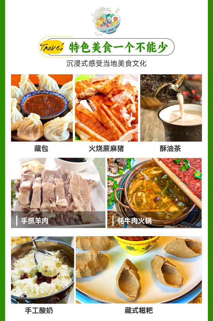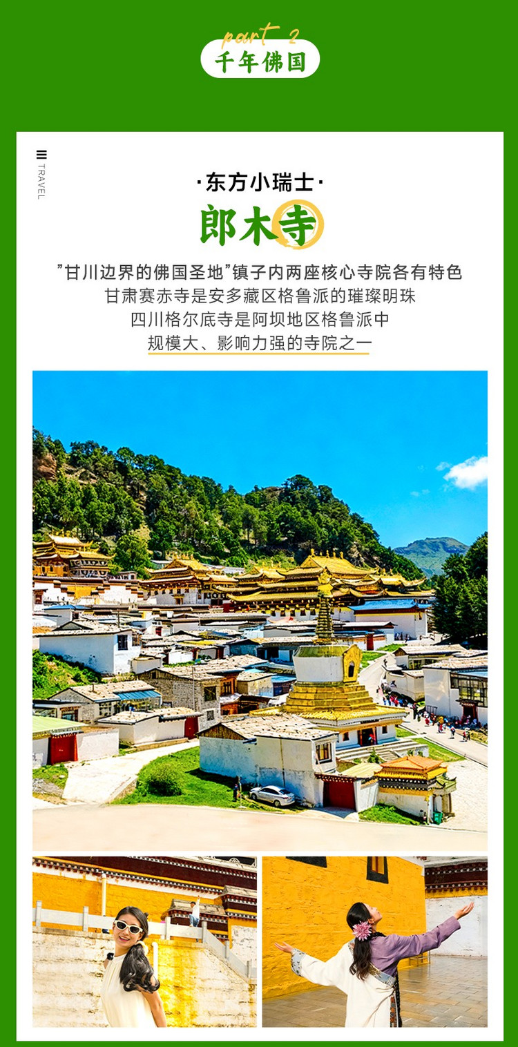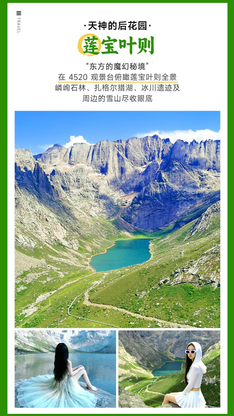 我们将从唐克镇出发,前往【莲宝叶则】(180km,车程4小时,游玩4-5小时)。莲宝叶则意为“尊严的玉石之峰”,是川甘青交界的花岗岩峰林景区,作为藏区神山,这里湖泊星罗棋布,山影倒映湖中,水色随光影变幻,景致如仙境。进入景区后,先探访核心【扎格尔措湖】(藏语“白色的长湖”)。湖泊背靠陡峭花岗岩峰,湖水清澈、游鱼可见,常年薄雾轻笼。大家可沿平缓木栈道漫步(约1.5小时),近距离赏湖光山色,在观景台拍照留念。湖边的经幡与玛尼堆,更添藏地韵味。随后驱车至【4520米观景台】,这里是俯瞰莲宝叶则全景的优选地。站在观景台,高山草甸、花岗岩峰林与云雾交织,光影很美。可与海拔标识牌合影纪念,注意缓慢行动,避免高原反应。游玩时可留意沿途经幡与玛尼堆,感受藏文化与自然的融合。景区四季景致不同,还能在休息区品尝酥油茶、糌粑等藏地美食。