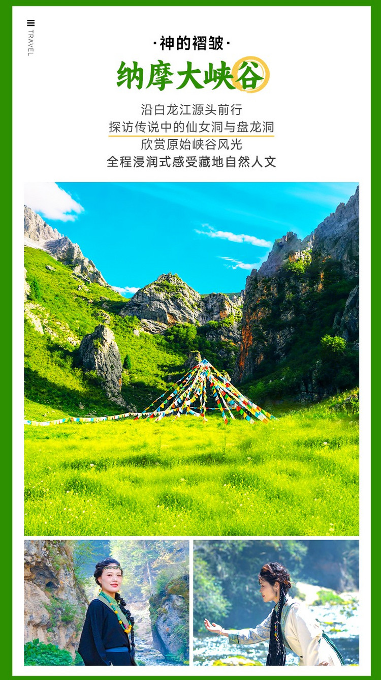 随后前往【纳摩大峡谷】(游玩2小时),峡谷入口处便是清澈的白龙江源头,河水滋养着两岸的生灵。峡谷内植被茂密,古木参天,溪流潺潺,空气湿润凉爽,沿途可见经幡飘扬、玛尼堆矗立,沿着峡谷内的步道前行,感受大自然的静谧与神奇。
