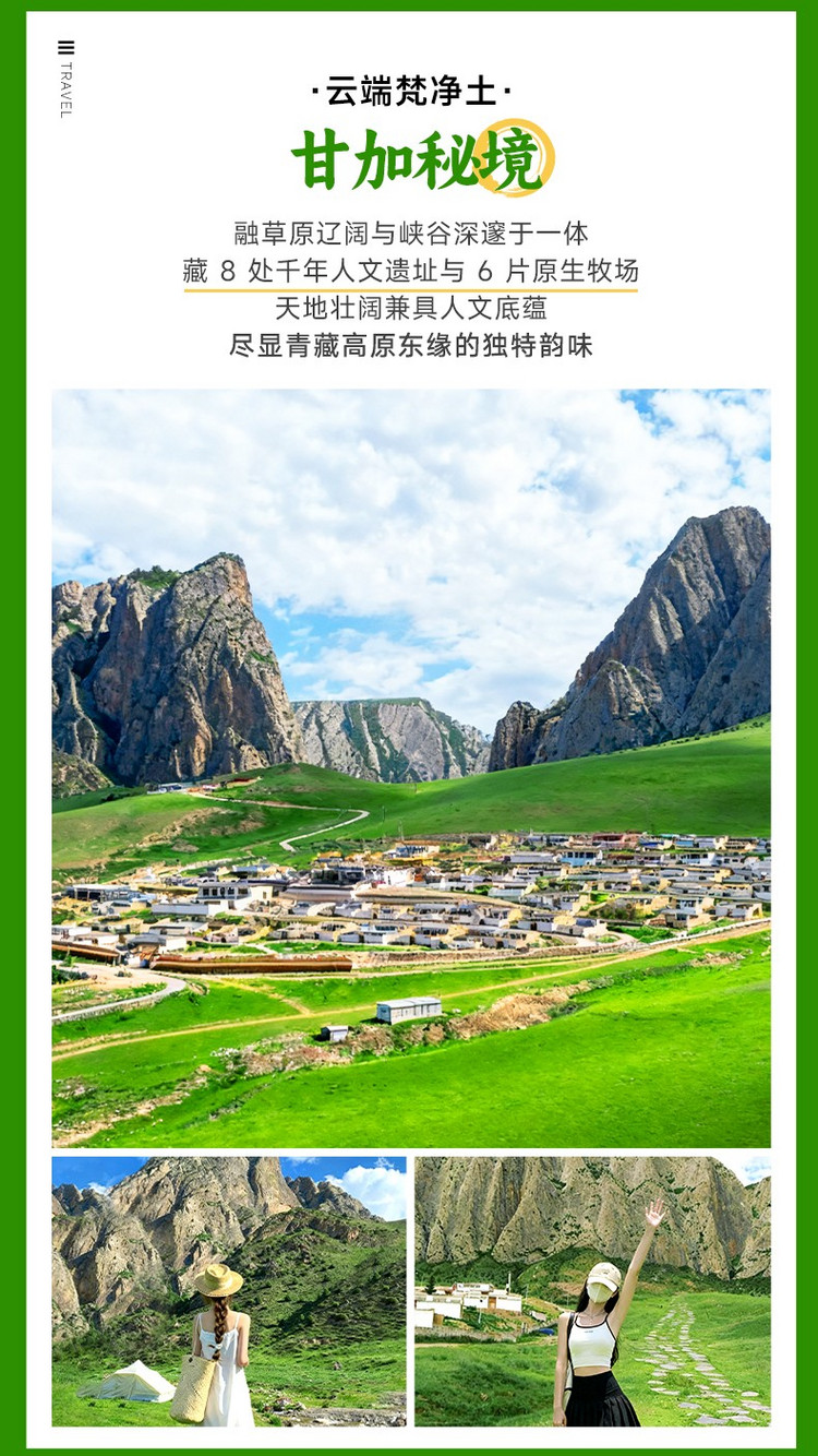 随后前往【甘加秘境】(40km,车程约40分钟,游玩3-4小时)。这里依次展开2大奇观:先抵达千年军事要塞【八角城】,独特的十字形城垣在航拍视角下如大地图腾,登上夯土城墙俯瞰,草原与雪山构成超美的取景框。随后自由参观【白石崖】,延绵15公里的纯白石壁如巨龙脊背横亘草原,可沿着峡谷步道寻找溶洞秘境,据说这里曾是苦修者的冥想圣地。