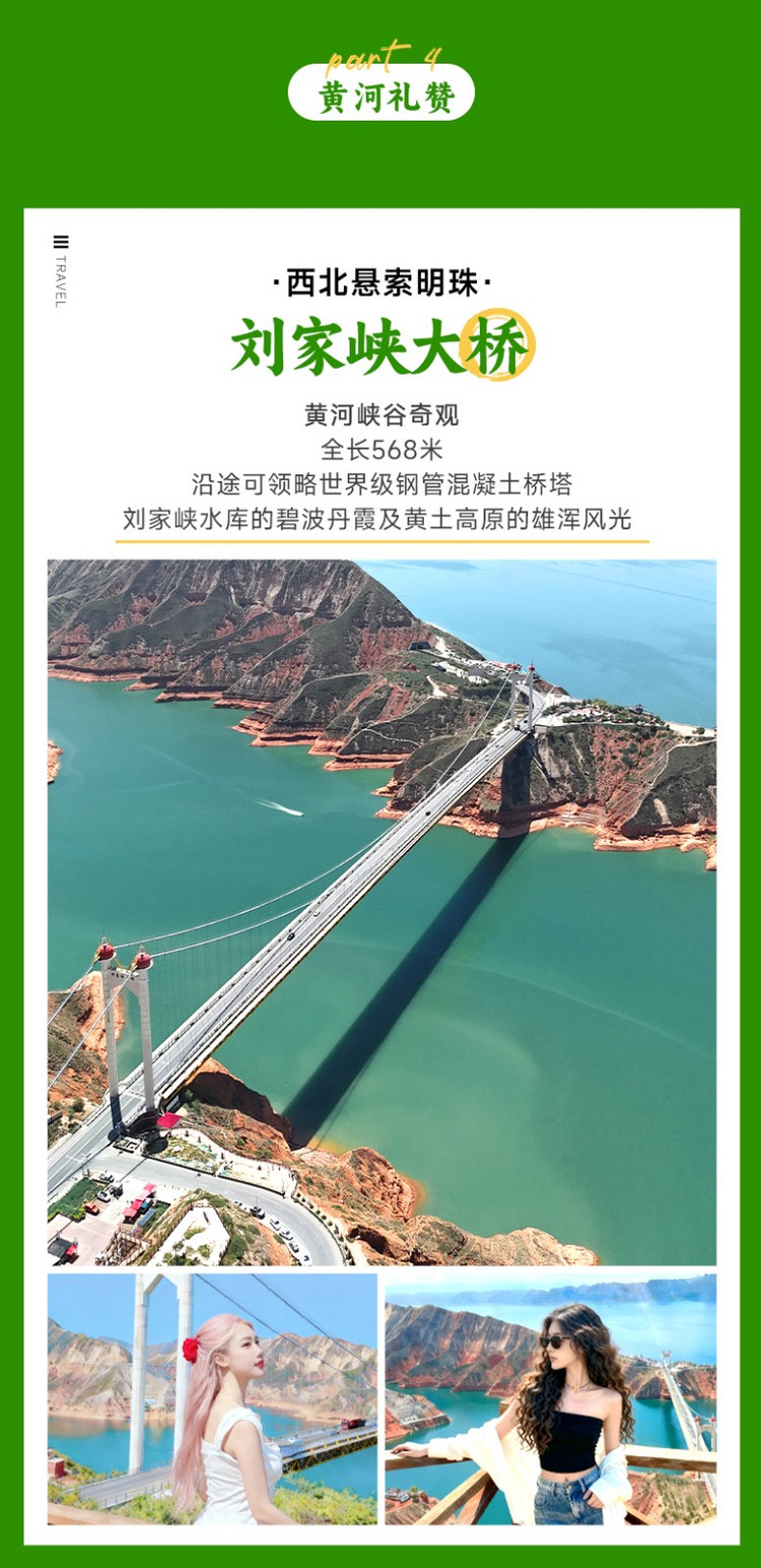 午后,我们将领略刘家峡的壮丽画卷。经过横跨峡谷的【刘家峡大桥】,您将在观景台俯瞰大桥如钢铁长虹般连接两岸赭红色的丹霞山体,脚下是碧绿湍急的黄河之水,构成一幅色彩对比强烈的宏伟画面。