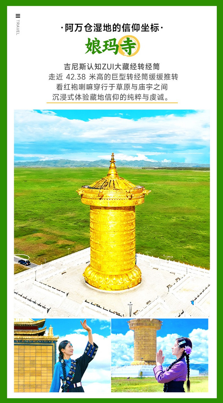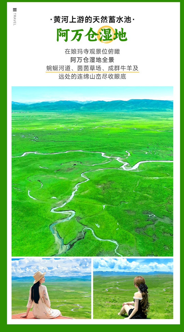 离开娘玛寺,驱车前往被称为“高原碧毯”的【阿万仓湿地】(10km,车程15分钟,游玩2小时)。这片湿地位于黄河支流沿岸,是若尔盖湿地的重要组成部分,广袤的草原与蜿蜒的河流交织,成群的牛羊在草地上悠闲觅食,远处的雪山隐约可见,构成一幅壮美的高原画卷。沿着木栈道漫步,呼吸带着青草气息的新鲜空气,也可以登上观景台一览湿地全景