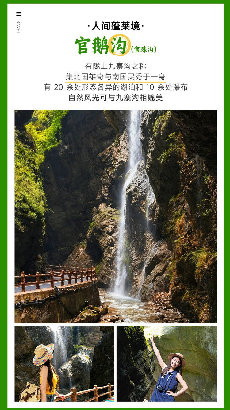 早餐后,来到中国超具潜力的小众美景【官鹅沟】(车程5KM,约15分钟,游玩3-4小时)。官鹅沟是西北十大神奇地理奇观之一 ,坊间一直流传“早知有陇南,何必下江南”的赞誉。景区内有湖泊、瀑布、原始森林、还有独具特色的羌藏村寨。相比于人满为患的九寨,这里更多了一份不被打扰的原始美。
