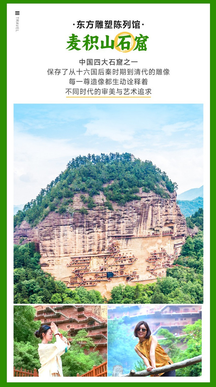 早餐后离开天水,开启这场期待已久的心灵之旅,一路高速来到【麦积山石窟】(车程约45公里,用时约1小时,游玩时间约3-4小时)。麦积山风光秀丽,素有“秦地林泉之冠”的美誉。麦积山石窟位于岩壁陡峭、绿植环抱的麦积山,是中国四大石窟之一。麦积山石窟是甘肃石窟之中非常重要、价值极高的一处,每一尊都别具个性,且鲜活,看遍西魏北周的历史兴衰。 因独特的泥塑优势,被称为“泥塑陈列馆”“东方雕塑馆”。麦积山的雕像,大的高达16米,小的仅有10多厘米。沿着山体修筑的木制栈道向上,沿途一座座石窟参观即可。石窟还保留大量宗教艺术资料,反映中国泥塑艺术发展和演变过程,为后世研究佛教文化提供丰富的史实。