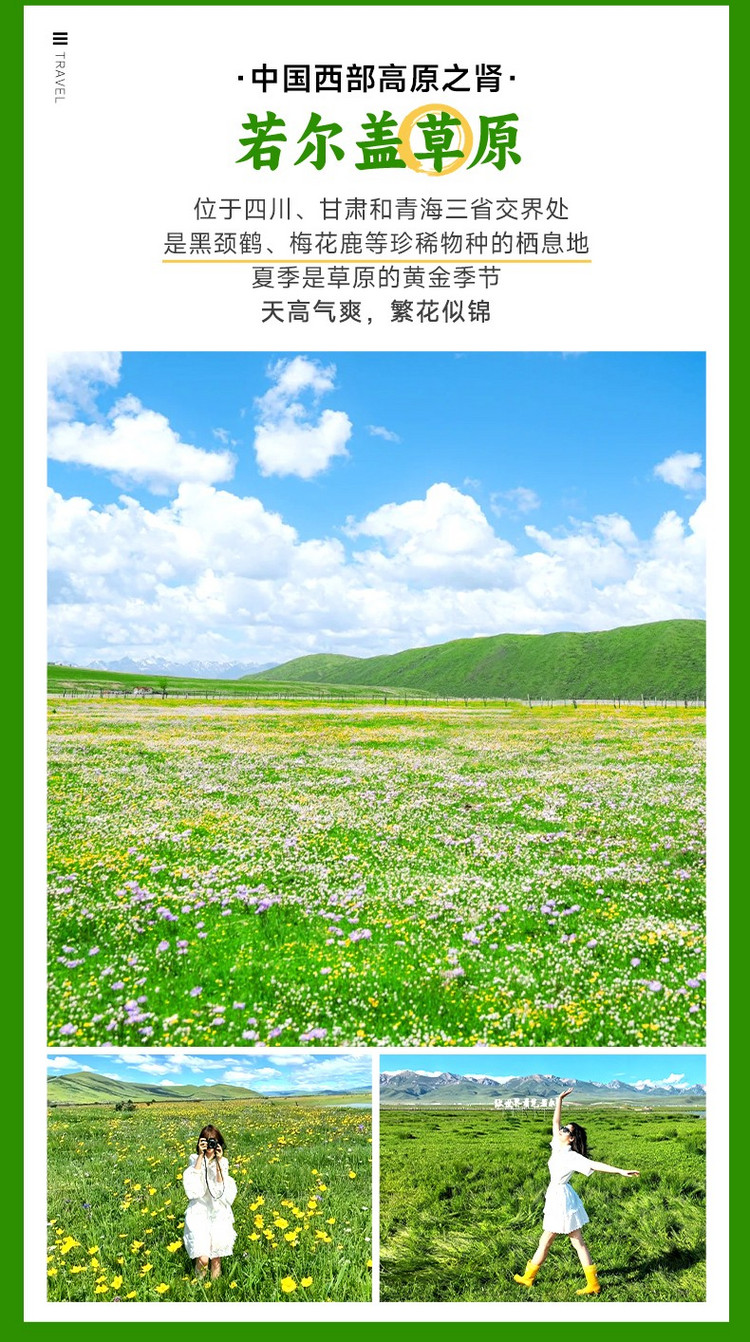 随后前往【若尔盖草原】(100km,车程2小时,游玩3-4小时),花湖位于四川若尔盖和甘肃郎木寺之间的213国道旁,是热尔大坝草原上的一个天然海子。花湖经典的时间是在五六月份,湖畔五彩缤纷,好像云霞委地,而湖中则开满了水妖一样的绚丽花朵,这种植物看起来平淡无奇,在雨水充沛的八月把纯蓝的湖水染成淡淡的藕色,时深时浅,像少女思春时低头的一抹酡红。