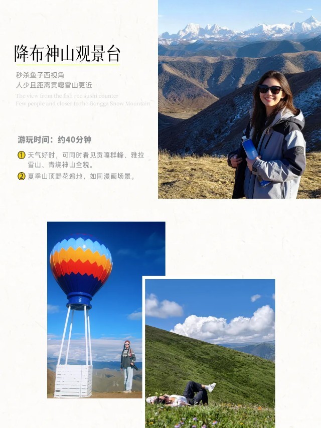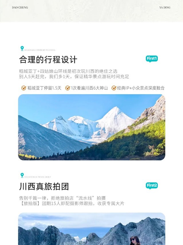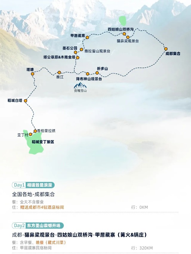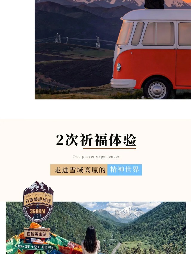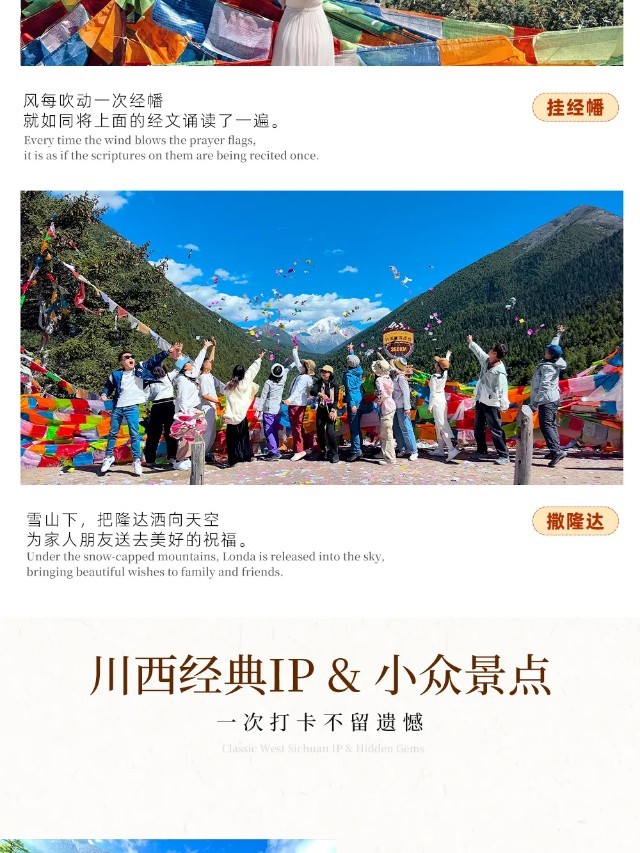 【行程概述】早餐后从雅江出发,穿过高尔寺山遂道,便来到了令人神往的“摄影天堂”【新都桥】,这里仿若一片如诗如画的世外桃源,神奇的光线,无垠的草原,弯弯的小溪,山峦连绵起伏,藏寨散落其间,牛羊安详地吃草……川西平原风光在此美丽地绽放。而后换车前往一处比鱼子西更小众、距离贡嘎雪山更近的观景台——【降布神山观景台】,天气好时,可以同时看见【贡嘎群峰】、【雅拉雪山】、【青绕神山】全貌,在这里随手一拍,皆是大片!山顶的秋千、经幡长廊更是网红拍照打卡地。游玩后越过【折多山】,在这里您可以观赏到【川藏第一关祈愿墙】(网红打卡点),上面摆放着“扎西德勒、一路顺风、吉祥如意”等字样的祈愿石。打卡后继续朝着甘孜藏族自治州首府——《康定情歌》中的康定行进,随后上【雅康高速】,穿越二郎山隧道,感受阴阳两重天,经雨城雅安上成雅高速返回成都。