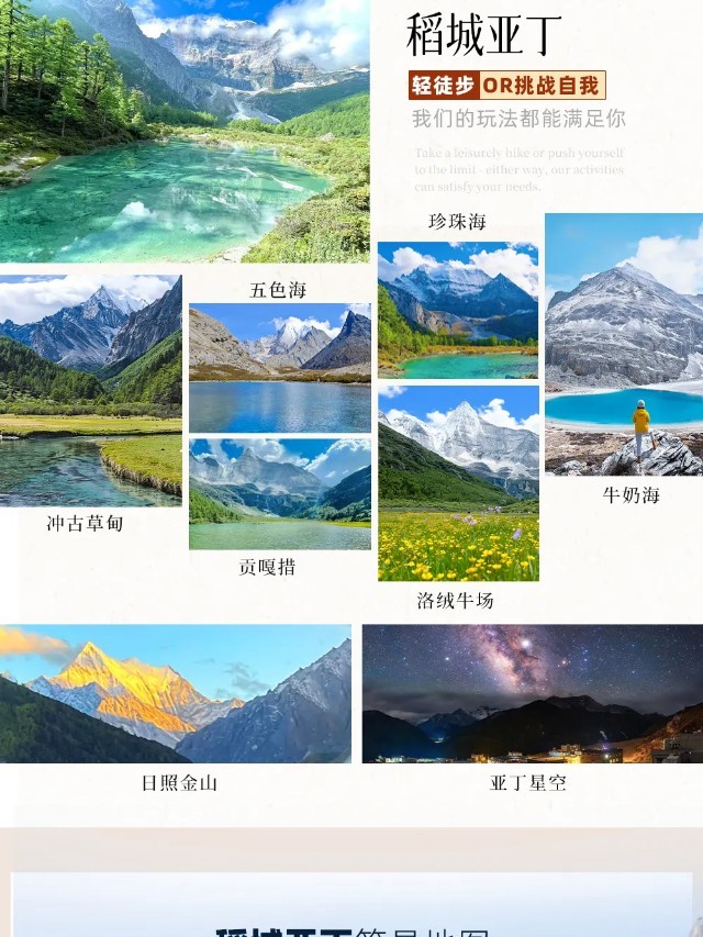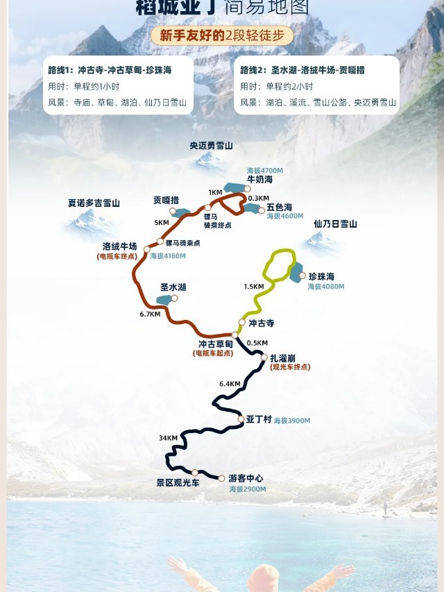 (4)当天游览线路参考:亚丁村~景区摆渡车/观光车3.4km~扎灌崩~徒步0.5km~冲古寺~徒步1.5km~卓玛拉措(珍珠海)~仙乃日神山~原路返回亚丁村拿行李~乘观光车出景区。