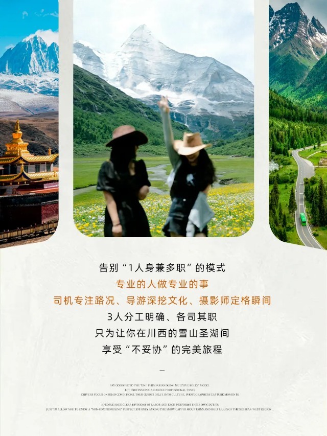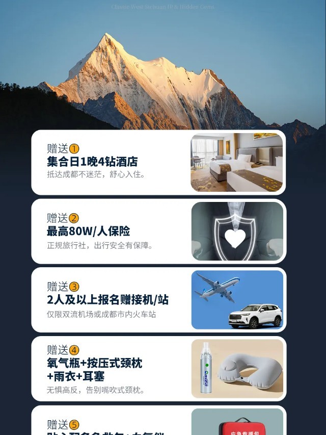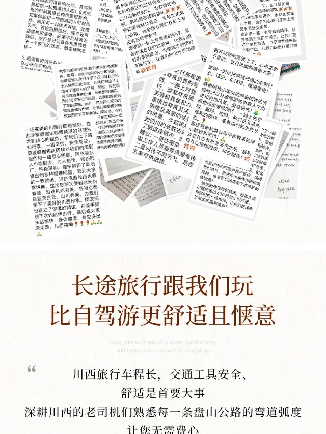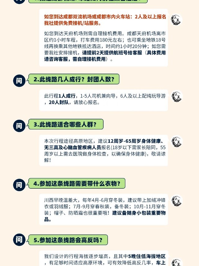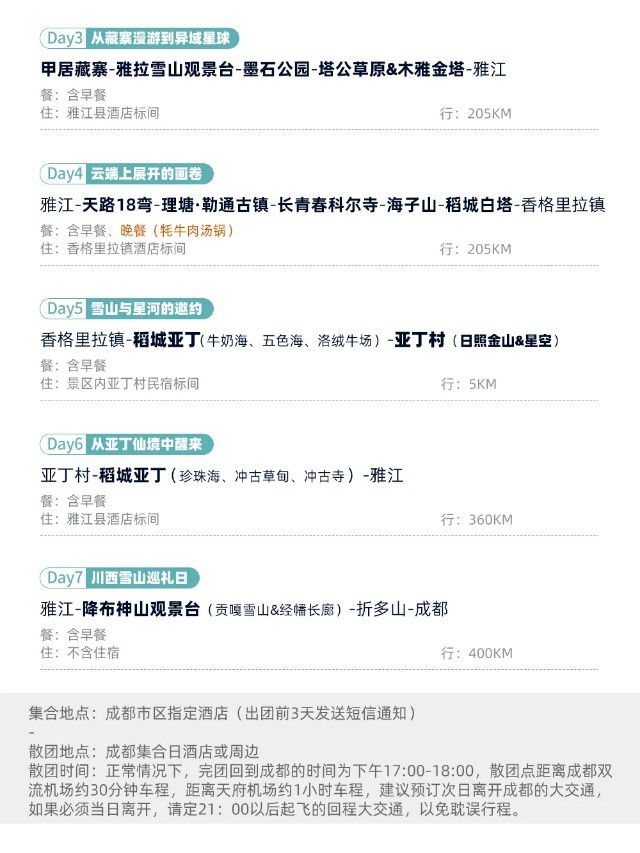 (3)以上行程时间安排可能会因天气、路况等原因做相应调整,正常情况下完团回到成都的时间为晚上17:00-18:00,散团点距离成都双流机场约30分钟车程,距离天府机场约1小时车程,建议预订次日离开成都的大交通,如果必须当日离开,请定21:00以后起飞的回程大交通,以免耽误行程;