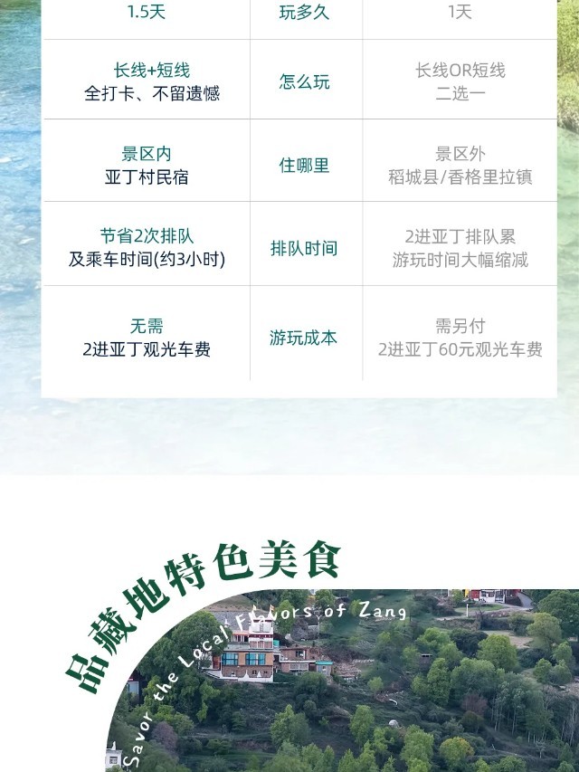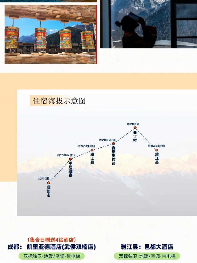 (2)亚丁村的住宿比较艰苦、条件非常落后,均为民居改建的游客接待点,请您做好相应心理准备,并理解这份纯朴原始的“真、善、美”,季节性停水停电,不可避免,请提前准备手电;