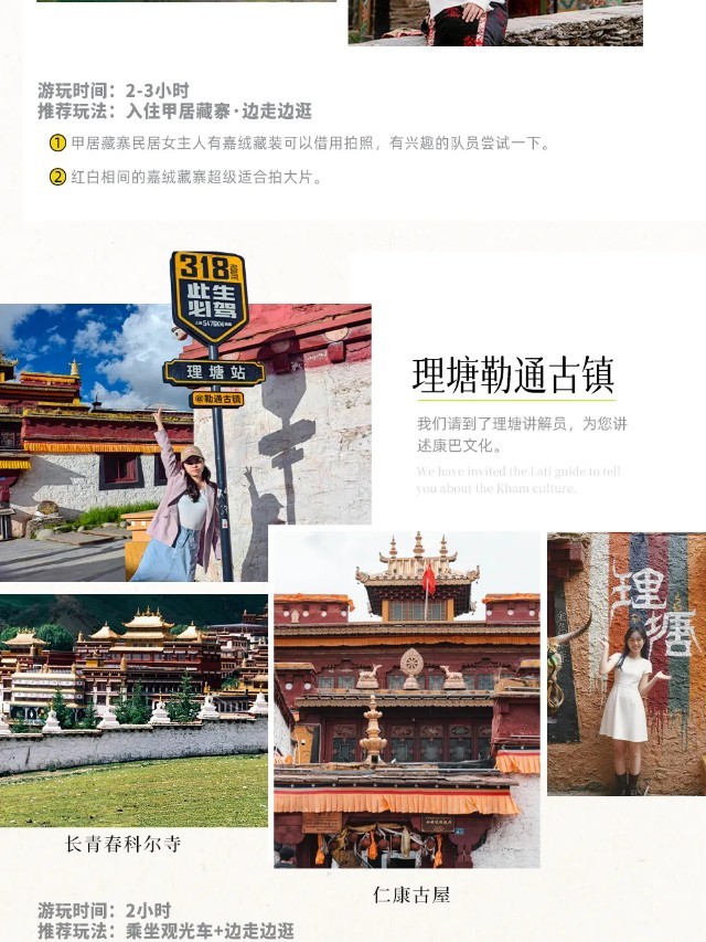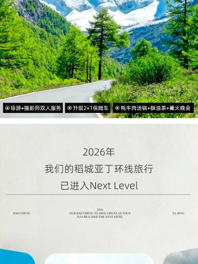 【行程概述】早餐后乘车离开雅江,沿途观赏【天路十八弯】的险峻,穿越【剪子弯隧道】,随后翻越【卡子拉山】(垭口海拔4718米),抵达【丁真的家乡】——理塘,这里风景绝美,六世达赖喇嘛仓央嘉措曾在诗里写下自己对理塘的向往:“洁白的仙鹤啊,请把你的翅膀借给我,我不会飞到很远的地方,我到理塘转转就回......‘’我们将在理塘游览《丁真的世界》宣传片里出现的【勒通古镇·千户藏寨】,这是全世界规模最大的传统藏寨群落,有超过4000栋的传统藏房,是探寻藏文化和康巴风情的不二之选。在这里,我们可以依次游览:【康巴人微博物馆】、【仁康古屋(先后降生过十三位德高望重的大活佛)】,随后参观康区历史最悠久、规模最大的藏传佛教黄教寺庙——【长青春科尔寺】,聆听它的传奇故事。游览后继续前行,经无量河,翻越形似兔子的【兔儿山】(垭口海拔4696米),途经青藏高原最大的古冰川遗址、稻城古冰帽——【海子山】自然保护区(海拔4500米),经桑堆小镇,在金秋季节可以观看【桑堆红草地】,当一座美丽的【白塔】映入眼帘的时候,我们就抵达了稻城,继续行车,晚上入住香格里拉镇。