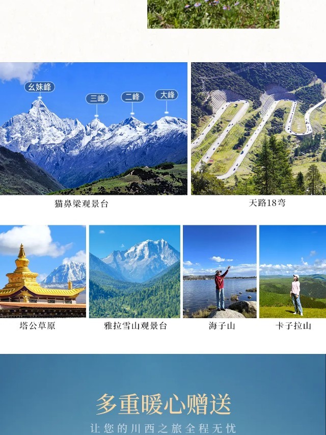 (2)如因堵车、交通管制等原因,今日15:00之前未能赶到四姑娘山,我们将放弃四姑娘山双桥沟的游览,敬请理解;