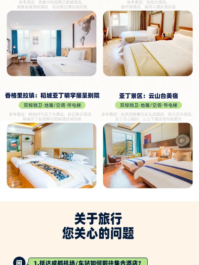 (2)到集合酒店报“大美稻亚+姓名”拿房,房费已付,押金自付。入住酒店的时间一般在集合日当天的14点以后,如果您提前到达且酒店房间未整理出来无法办理入住,可将行李暂时寄存在前台,先在市区周边自由游玩;