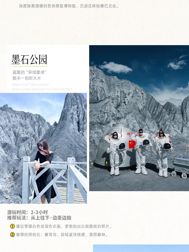 【行程概述】今天的行程比较轻松,沿途景色也很漂亮。早餐后游览中国最美的六大乡村古镇”之首——【甲居藏寨】,整个藏寨依着起伏的山势迤逦连绵,在相对高差近千米的山坡上,一幢幢藏式楼房洒落在绿树丛中,或星罗棋布,或稠密集中,或在高山悬崖上,或在河坝绿茵间。之后车览绵延十几公里的天然盆景——【牦牛河谷】,途中还可远眺被藏族人民誉为神山的【雅拉雪山】,继续前行,便可远观莲花古刹——【惠远寺】,随后抵达“油画世界”八美,游览川西异域星球——【墨石公园】,“春赏格桑夏避暑,秋观彩林冬踏雪”,您可以先从高处俯瞰墨石全景,然后慢慢往下走,沿着栈道深入墨石区域的内部,和墨石来个近距离接触,栈道旁就是高耸的墨石,非常炫酷,是拍摄人像的绝佳站位!游览后继续行车抵达【塔公草原】,藏语意为“菩萨喜欢的地方”,参观【木雅金塔】,眼前是金光闪闪的寺庙,远处是壮丽的雅拉雪山,这里的景色一定会令您流连忘返。随后一路欣赏藏寨、草原、牦牛、蓝天、白云、小溪、杨树……前行至雅江入住。