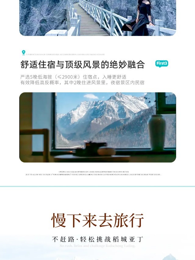 (8)关于稻城亚丁景区限流:为避免人流高峰聚集,稻城亚丁景区最大承载量为16850人,其中牛奶海、五色海区域游客承载量为3900人,我们将提前为您预约门票,如因旺季预约人数过多,不能游览牛奶海、五色海,我们将根据实际情况调整游览路线。