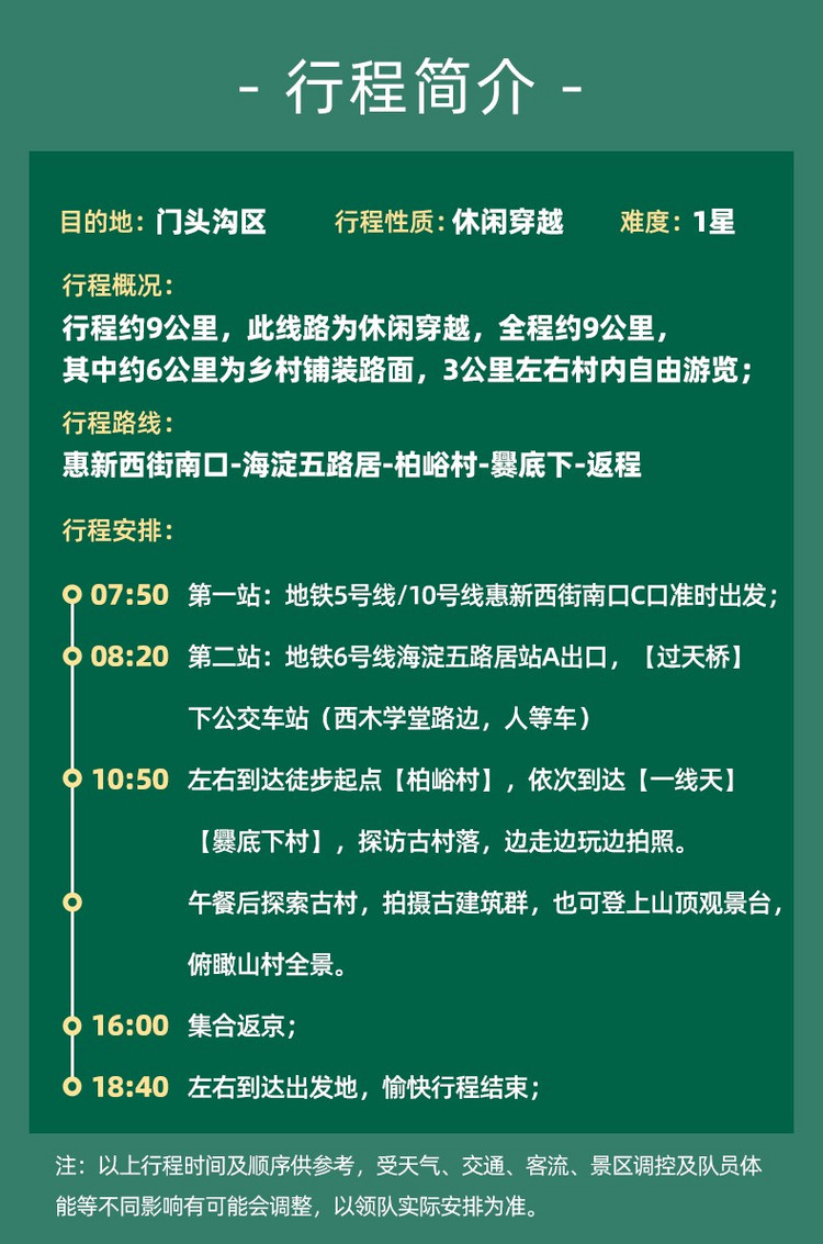 注:以上行程时间及顺序供参考,受天气、交通、客流、景区调控及队员体能等不同影响有可能会调整,以领队实际安排为准。