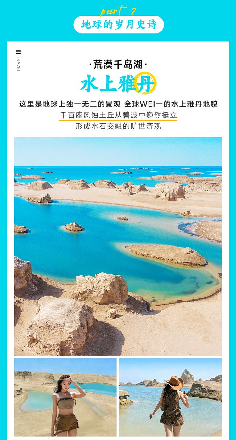 下午,前往【水上雅丹】(约300公里, 4.5小时车程,游玩约2-3小时)。这里是国内仅有的水上雅丹地貌群,被誉为“荒漠千岛湖”。千百座风蚀土丘散落在湛蓝湖水中,形如整装待发的远航舰队,气势恢宏。登高远眺,湖水环绕雅丹,光影交错间随手一拍皆是视觉大片。