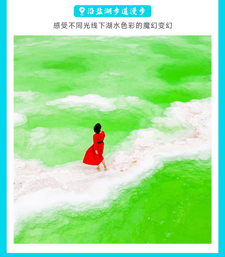 早餐后,我们乘车前往【察尔汗盐湖】(约400公里,4.5小时车程,游玩约2-3小时),这里不仅是亚洲zui大的盐湖,更是一处会呼吸的色彩艺术馆,这里的湖水就像被施了魔法,有时候是清透的苹果绿,有时候是温柔的薄荷青,在纯白盐晶的映衬下,宛如大自然打翻的调色盘。阳光洒落时,湖面泛起粼粼波光,那一抹青绿仿佛有了生命,随光影流转而变幻深浅。
