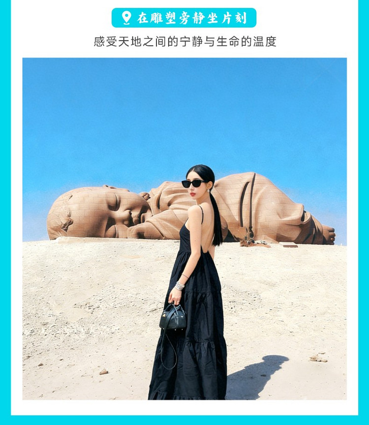 下午,前往位于瓜州戈壁的雕塑【大地之子】(约120公里,1.5小时车程,游玩约1小时),这座长达15米的婴儿雕塑静卧于茫茫荒漠,宛若沉睡于大地怀抱的婴孩,栩栩如生、恬静安详。作品以超现实的表达,将生命与荒原、当代艺术与丝路文脉融为一体,成为戈壁中一道深邃而动人的风景。