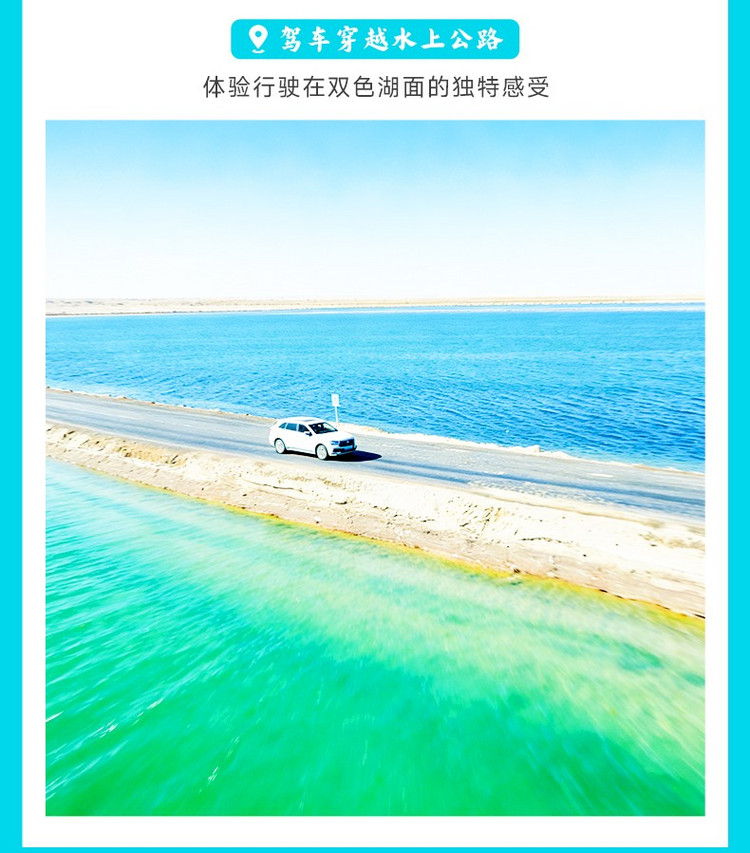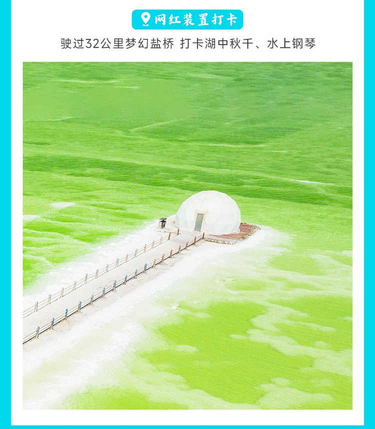 行程中,我们将驶过独特的“万丈盐桥”,一条由盐筑成的神奇之路。放眼望去,无垠的盐田在阳光下闪烁着晶莹光芒,纯白盐海延伸至天际,倒映着蓝天白云,营造出似梦似幻的“天空之境”奇观,让人仿佛置身于纯净的异度空间。走进湖心,你会看见神奇的自然盐花,形状像珊瑚又像小蘑菇,晶莹剔透特别可爱。解锁网红打卡点:湖中间的秋千、水上的白色钢琴、还有形状特别的礁石群,随便一站都能拍出氛围感拉满的照片。