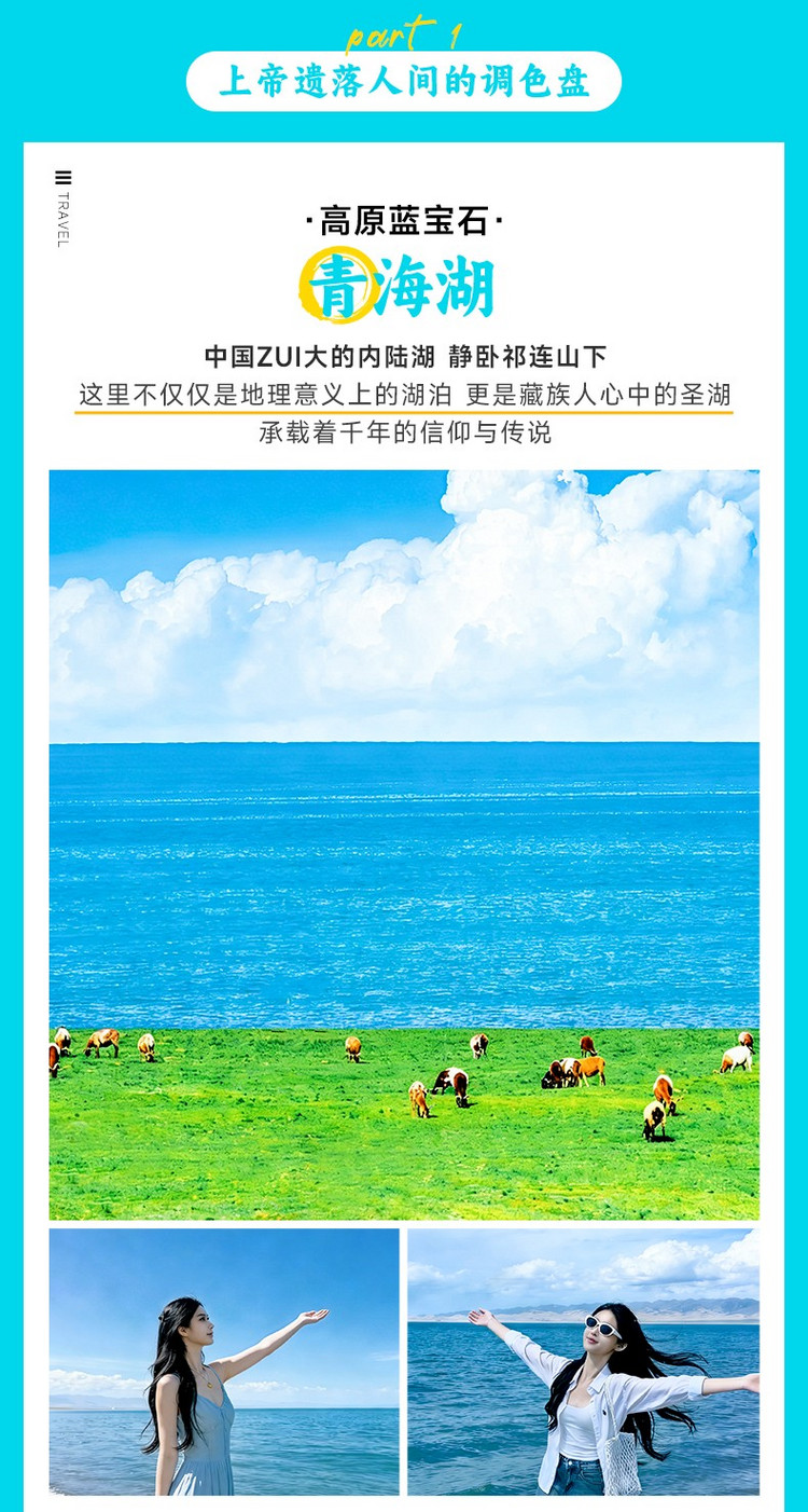 随后沿环湖公路继续前行,沿途草原连绵,牛羊遍野。行驶约50公里后抵达【青海湖】(1小时车程)。这里云朵触手可及,湖水湛蓝如宝石,盛夏时节更添一抹金黄油菜花海,宛若上帝挥洒出的磅礴画卷。我们将在此停留充足时间,让你尽情沉浸于这片天地之美。