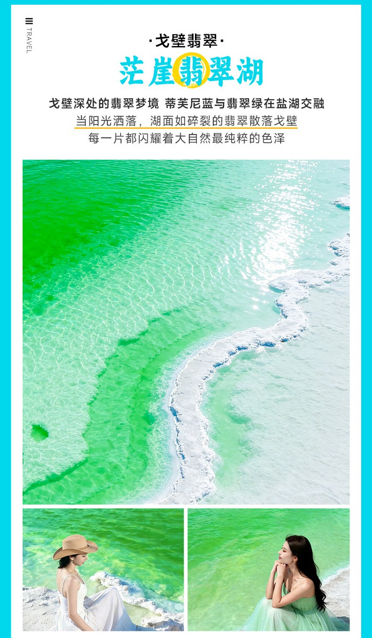 随后,探访柴达木盆地深处的秘境【茫崖翡翠湖】(约25km,30分钟车程,游玩约1.5-2小时),这片大多数游客未曾踏足的盐湖,犹如现实版的“天空之镜”,湖水呈现蒂芙尼蓝与翡翠绿交织的梦幻色泽。你可沿盐滩步道漫步,拍摄倒映着雅丹地貌与远山的镜面大片,或在指定区域体验盐滩足浴,感受盐花与湖水的交织之美。特别安排透明小船体验,泛舟湖面,仿佛漂浮于翡翠梦境之中。