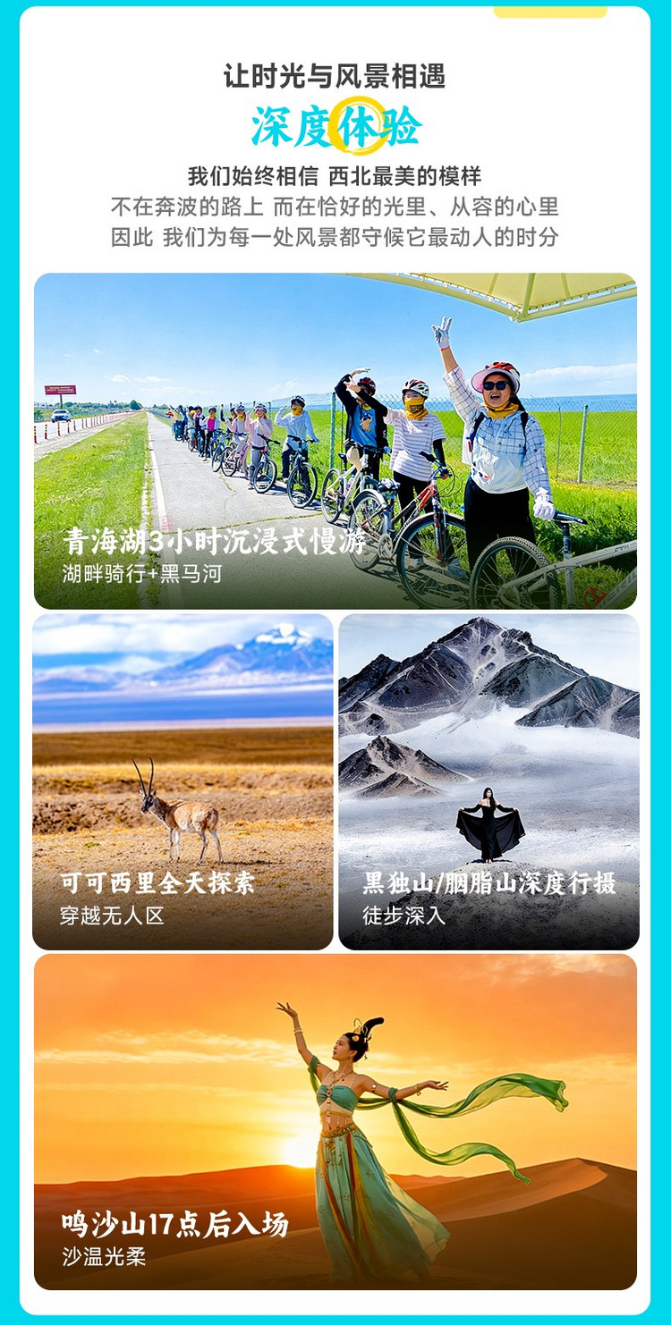 青海湖环湖公路被誉为“中国zui美公路”之一。我们特别赠送【青海湖骑行体验】(约1小时),在湖畔专属绿道安全骑行,迎风而行,穿梭于湖光、草场与山色之间,以自由的方式亲近圣湖。