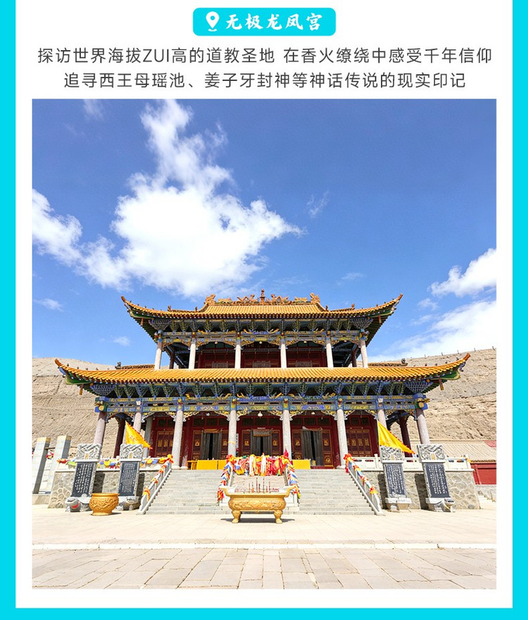 中午,参观【无极龙凤宫】(停留约20分钟),这里是世界海拔最高的道教圣地(3800米),供奉西王母、太上老君等神像,观内香火缭绕,可在此为家人祈福,感受道教文化与昆仑传说的交融,建筑融合汉藏风格,院内昆仑文化石刻值得细细品味。