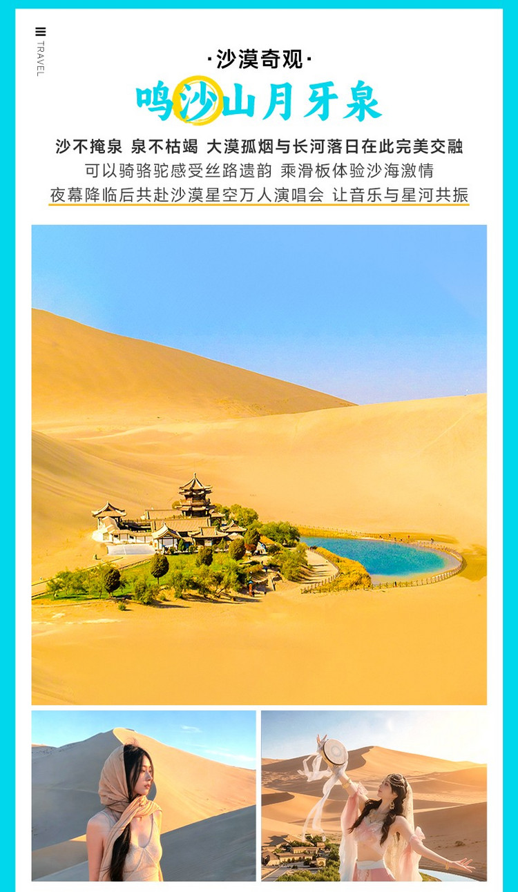 下午,前往【鸣沙山月牙泉】(约25公里,30分钟车程,游玩约4-5小时)沙山连绵起伏,随风鸣响,其声如雷,相传是因沙粒中的石英晶体摩擦生电,与风蚀形成的孔洞共同作用而产生共鸣;一弯新月般的清泉静卧沙坳,千年不涸,其水源来自地下古河道与断层裂隙的持续补给。这片沙泉共生的奇迹,被古人尊为“佛赐圣水”,王维笔下“大漠孤烟直,长河落日圆”的诗意在此触手可及。