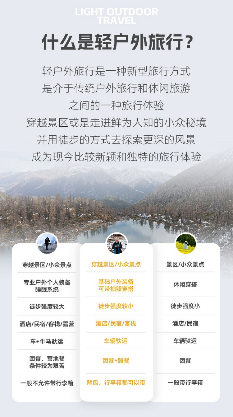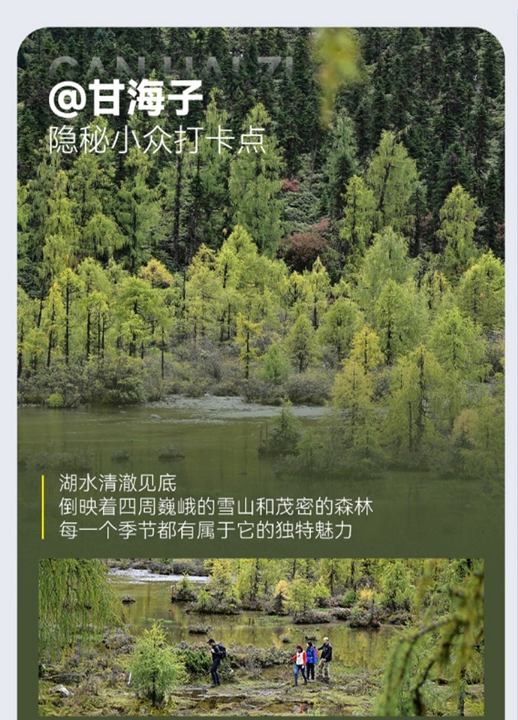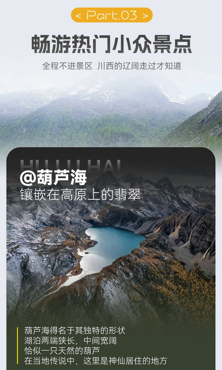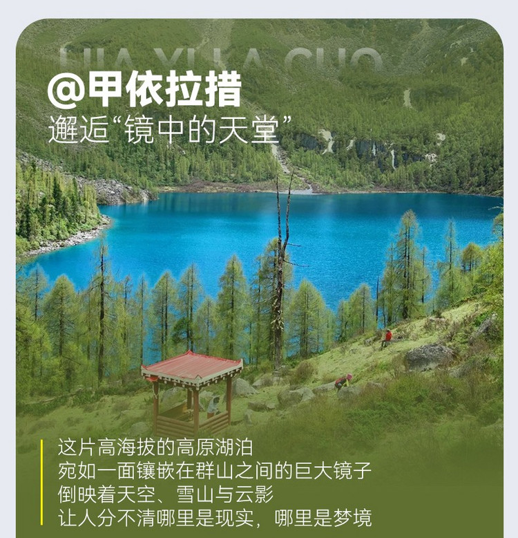 行程概览:早餐后告别党岭村,乘车来到徒步起点,开始徒步前往有着小众秘境的代表之一的甲依拉措海子,与葫芦海隔山相望,最后返回成都结束精彩的横断秘地徒步之旅。到达成都的时间大约在晚上22点左右,建议订次日的大交通。