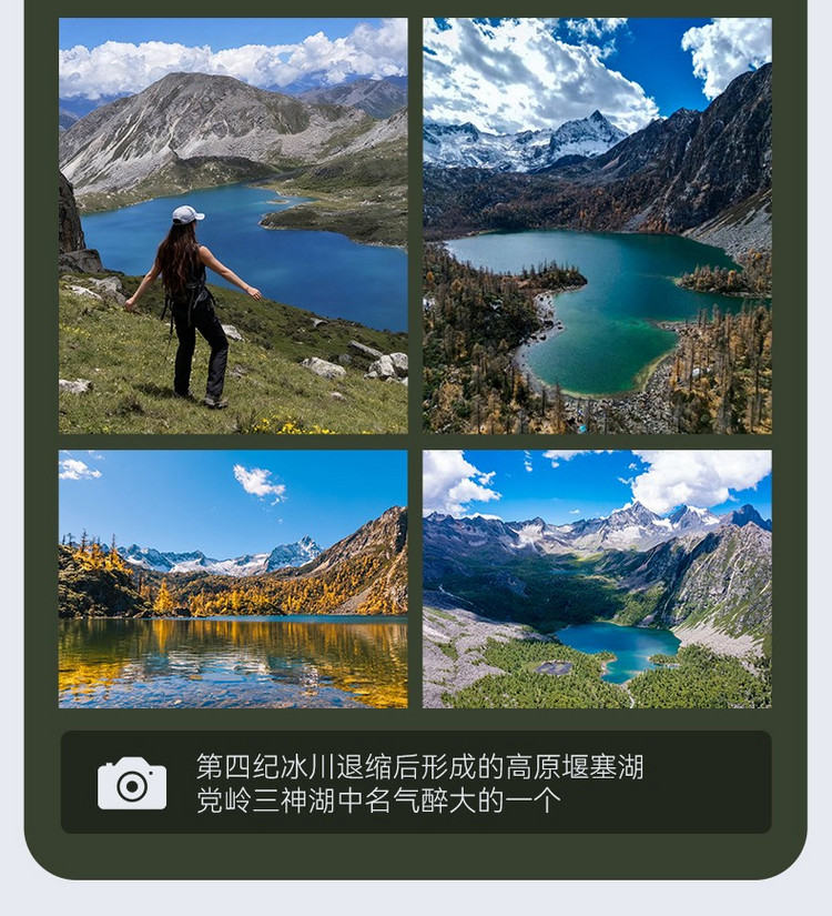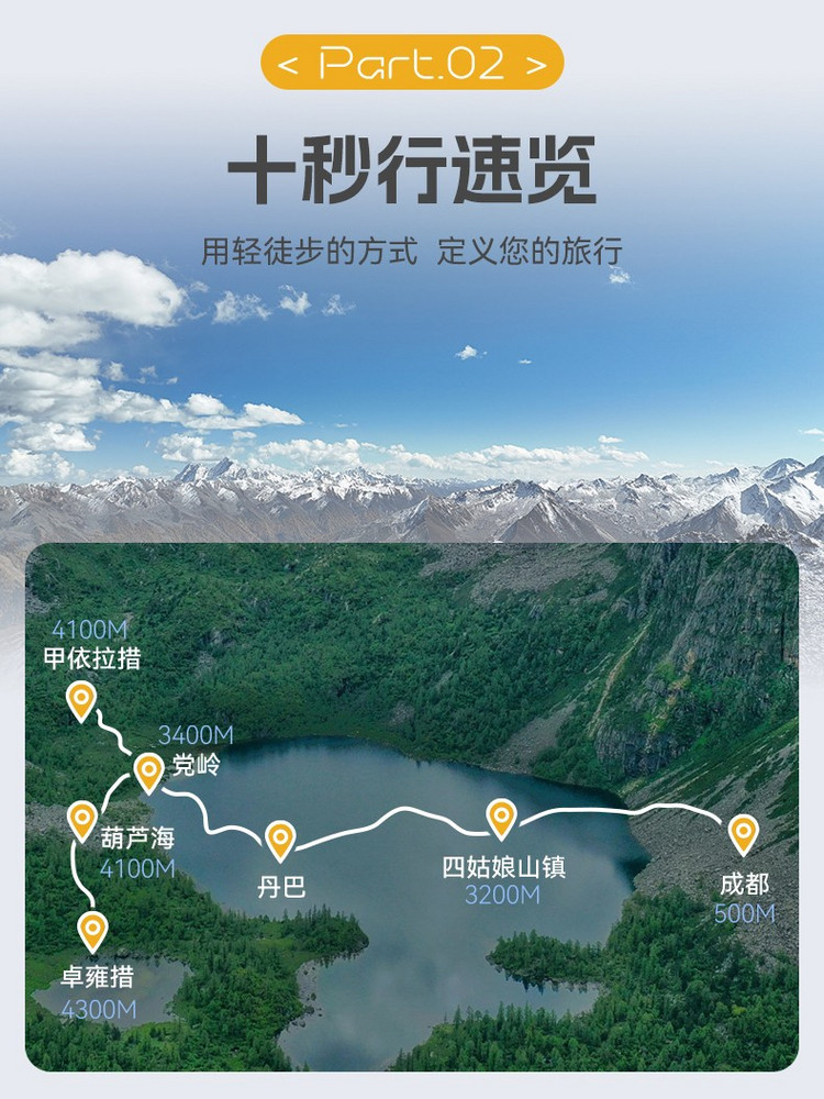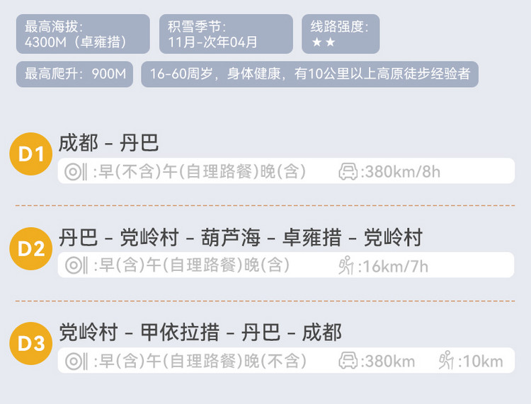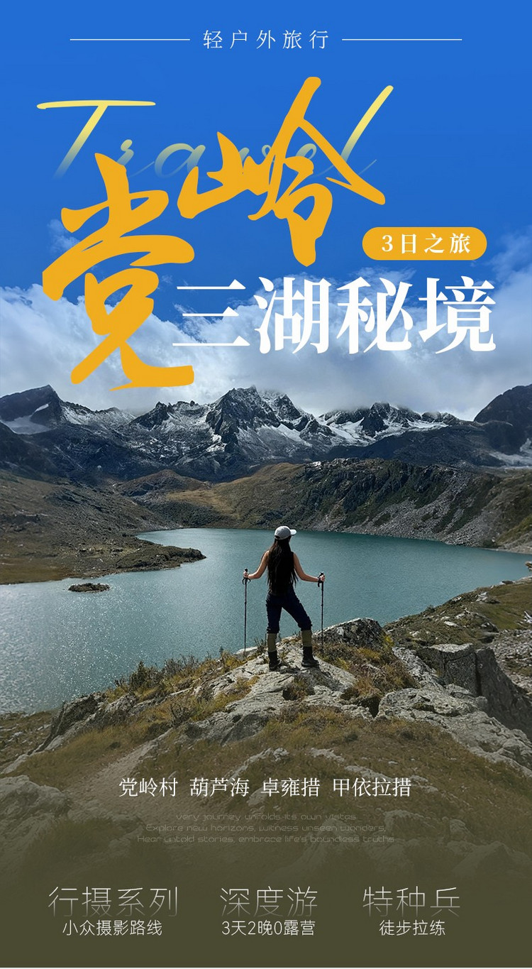 行程概览:在丹巴整理好装备出发,坐车2小时左右到达党岭,徒步进入横断山脉中最迷人的胜地。沿途欣赏党岭迷人的自然风光。沿着柯鲁河谷上行,来到美丽的葫芦海。葫芦海是状似葫芦的湖泊,由一大一小的两个湖泊组成,继续前景能观赏到小葫芦海,如体力不好的伙伴就可以在葫芦海多游玩一会,体力好的伙伴可以继续前行前往卓雍措往返6公里爬升200米,非常考验个人能力的一段路,爬上卓雍措,则我们就来到了葫芦海的最佳光景台,在冰川的加持下越发神圣,下午时分原路返回党岭村。