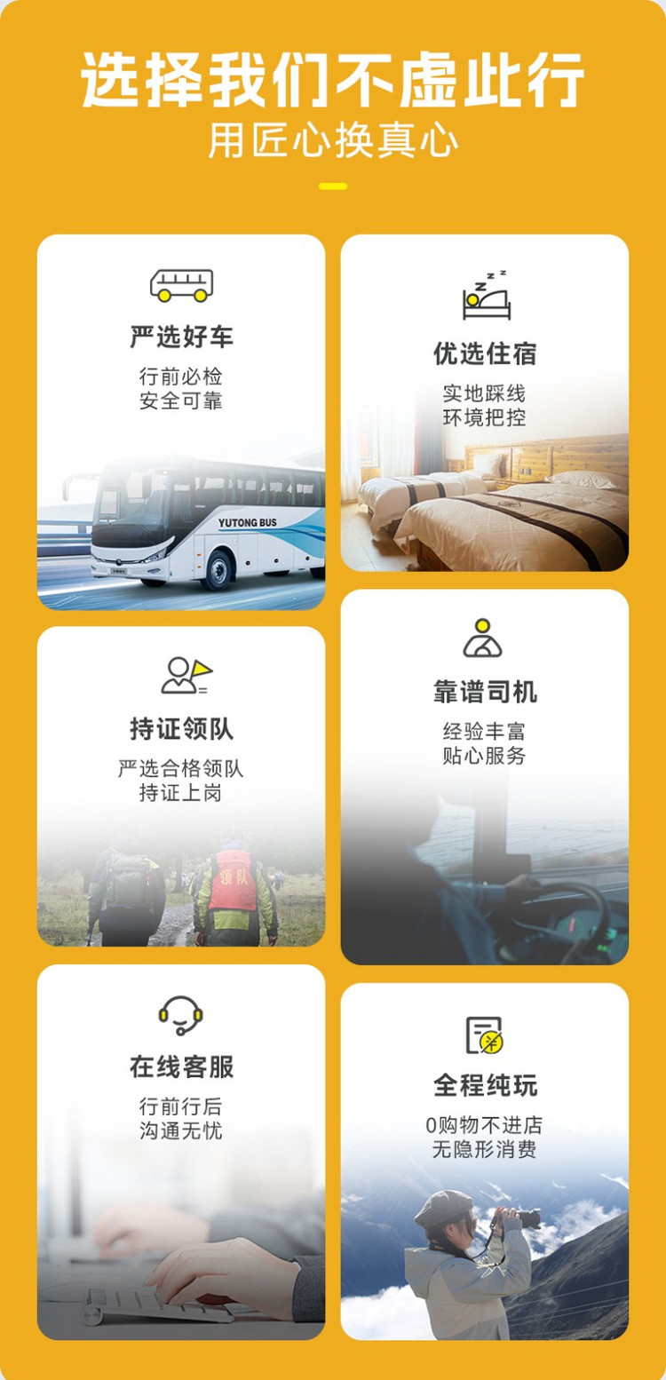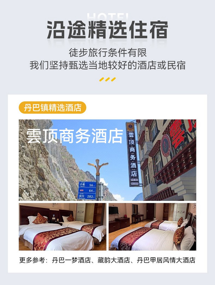 1.因丹巴至党岭为乡道,如遇大巴车无法通行,则换成当地中转车费用150元/人(往返),需要自行承担。