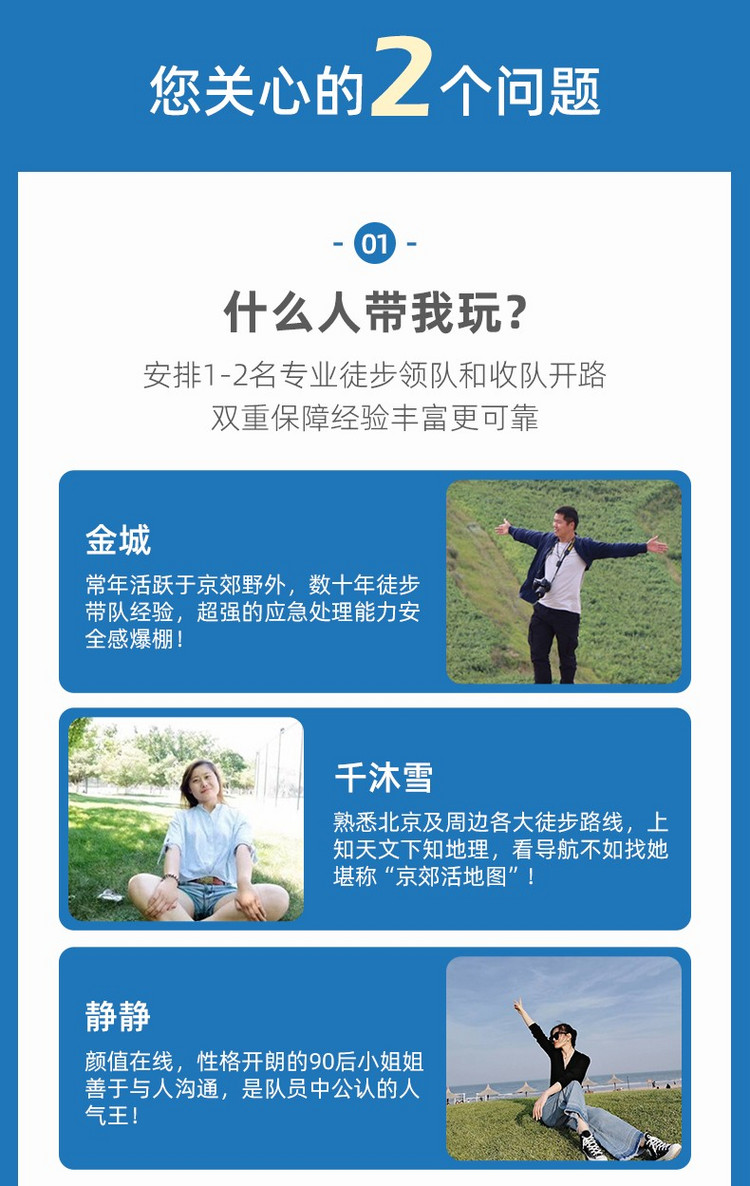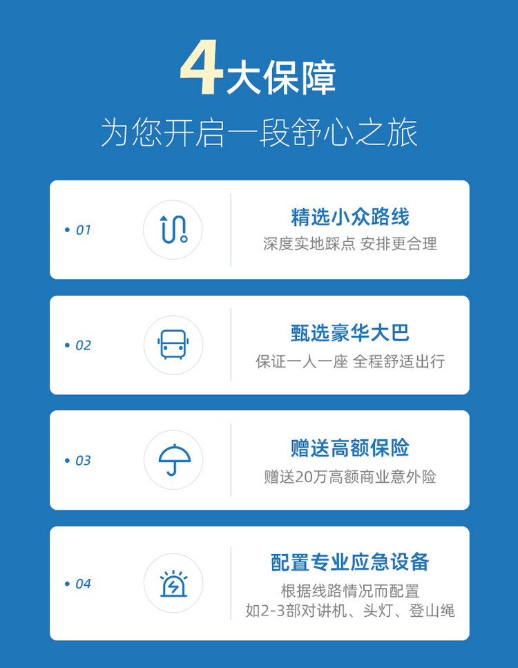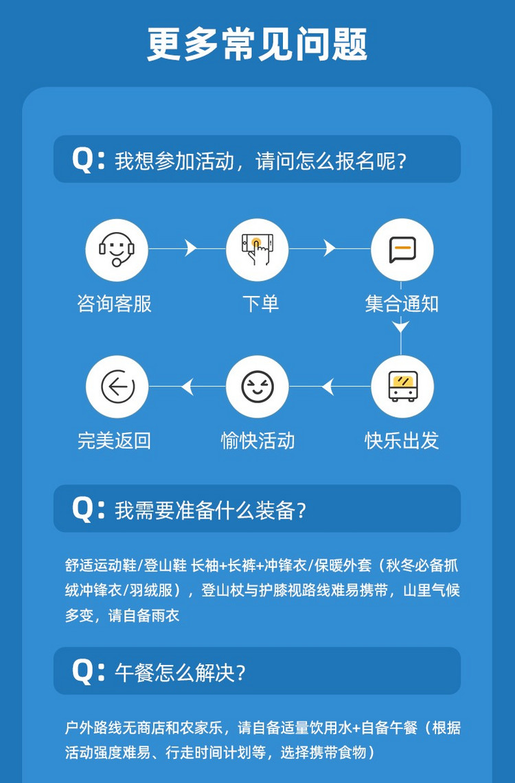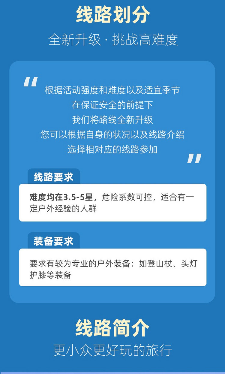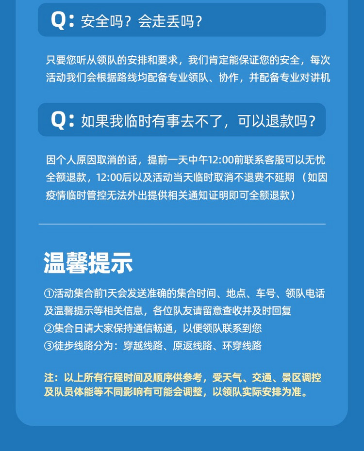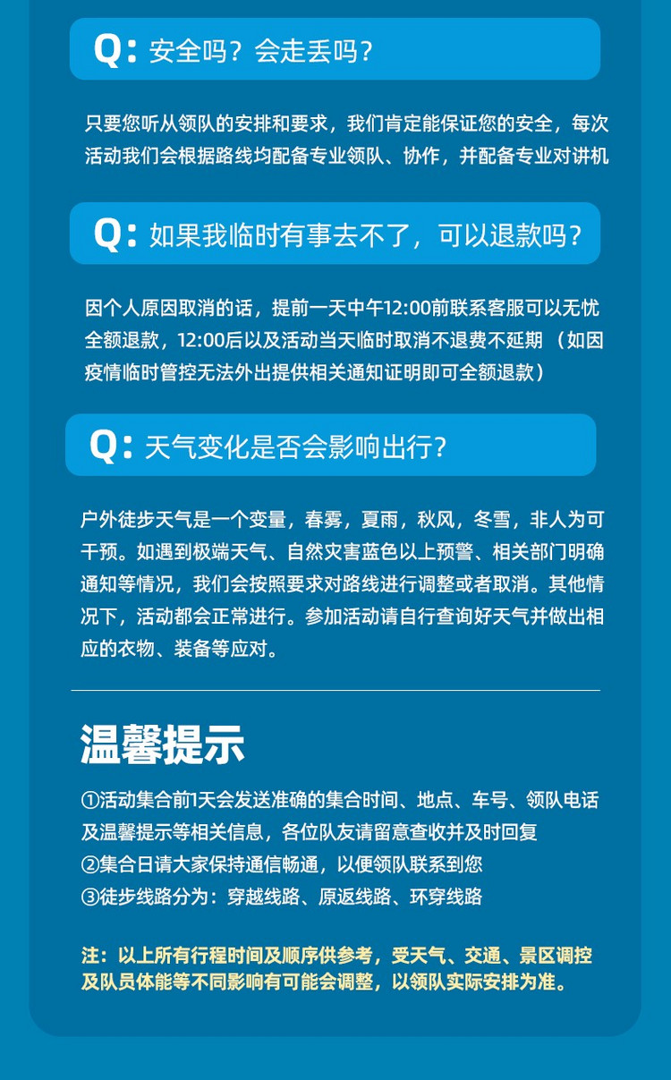 注:以上时间为正常安排时间,参与者体力不同,耗时可能会有差距。如遇天气、道路堵车、景区管控等外在因素影响,以领队安排为准。