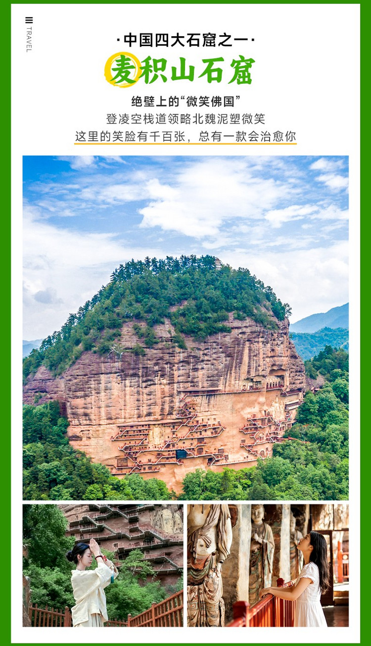 早餐后离开天水,开启这场期待已久的心灵之旅,一路高速来到【麦积山石窟】(车程约45公里,用时约1小时,游玩时间约3-4小时)。麦积山风光秀丽,素有“秦地林泉之冠”的美誉。麦积山石窟位于岩壁陡峭、绿植环抱的麦积山,是中国四大石窟之一。