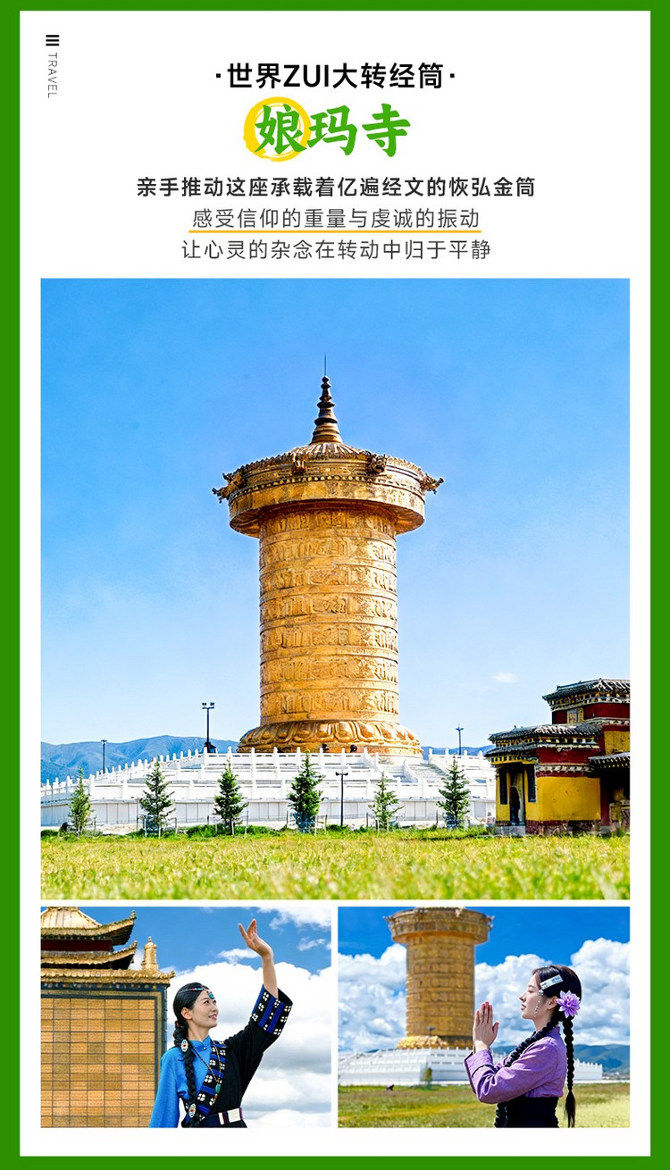 随后前往藏地著名的【娘玛寺】(约8km,车程约11分钟,游玩1小时)。这里是安多藏区重要的宗教场所,寺内大经堂气势恢宏,酥油灯长明,壁画与唐卡色彩艳丽、题材丰富,生动展现着藏传佛教的千年传承。在这里,您可以静静聆听诵经声,感受宗教信仰带来的心灵震撼,与当地僧人温和交流,深入了解藏地的宗教文化习俗。
