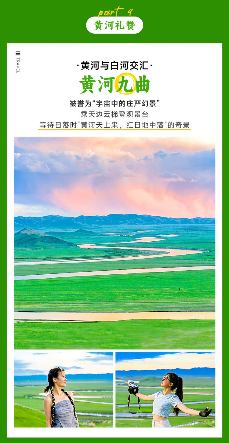 游览完毕后,我们将乘车前往【九曲黄河】(188km,车程3小时,游玩2小时)欣赏日落,黄河在四川若尔盖县唐克乡与白河汇合,形成了壮美的九曲黄河大转弯,能观赏到奇特且壮丽的自然景观,也是摄影师钟爱的取景地。观赏黄河九曲大转弯,唐克镇索克藏寺后面小山的山顶视野非常好,这里也是观看日出和日落的优选位置。 可以爬楼梯或乘坐电梯到达观景台。观景台上的景色会让您忘却一切烦恼,只享受当下。
