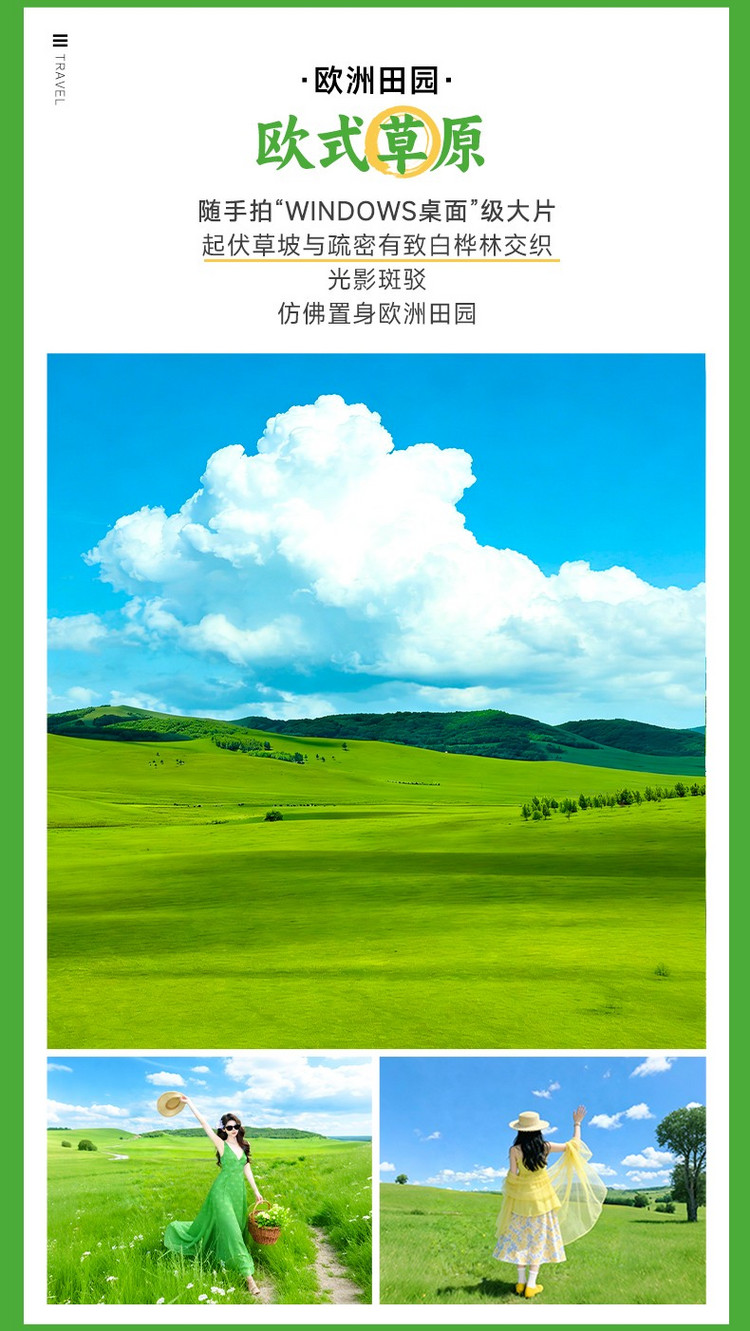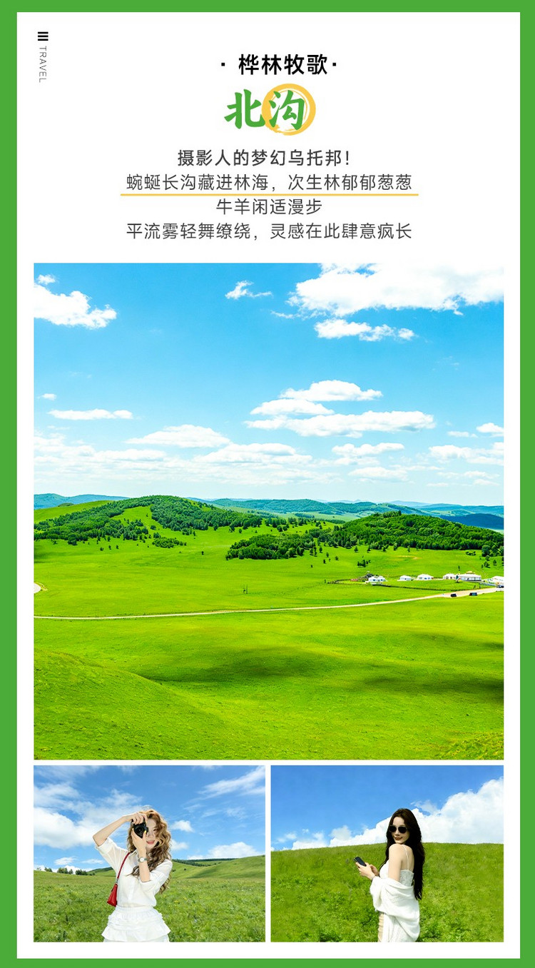 【北沟】沉浸式体验 “风吹草低见牛羊” 的经典意境,这里是马场天然放牧区,山坡白桦成林,沟底塘柳错落,蓝天、白云、碧草、牛羊相映成趣,感受草原原生态之美。