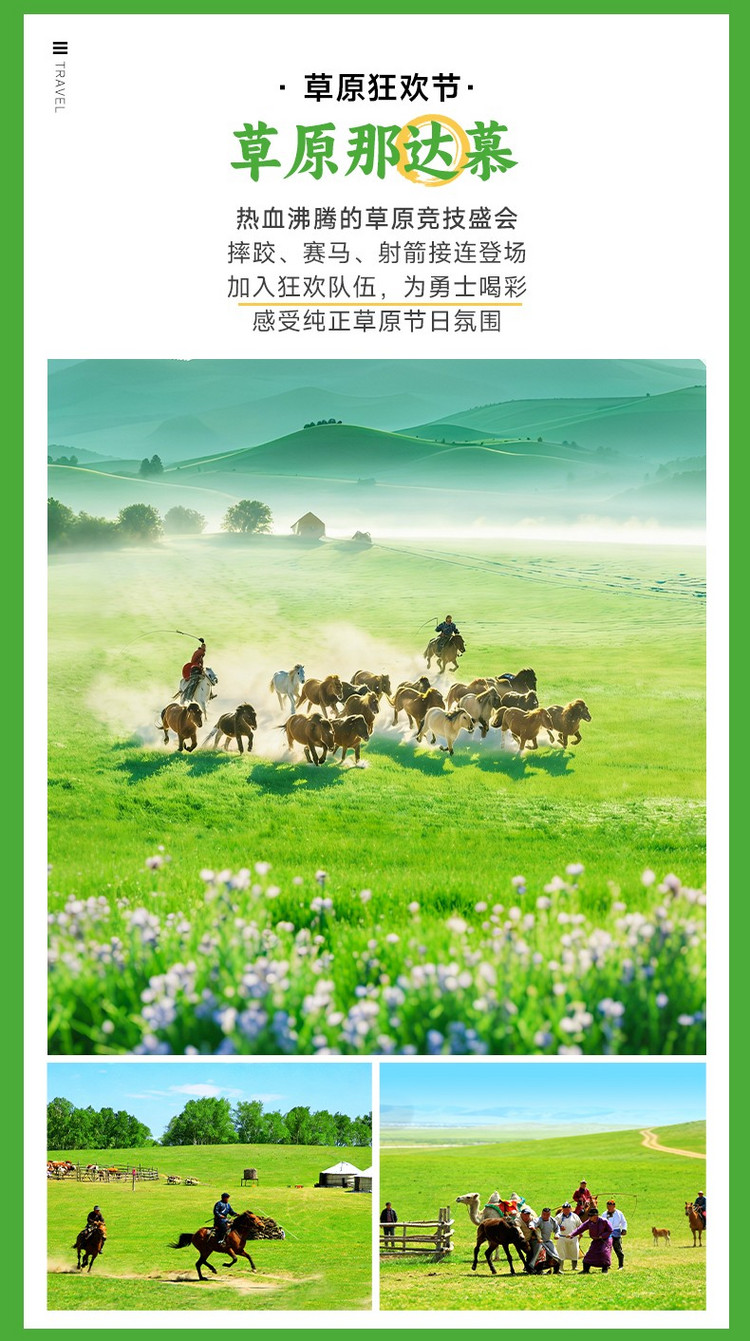 随后参加【那达慕盛会】,这是蒙古族隆重的传统节庆,专属草原的热情与豪迈在此拉满!看专业骑手策马扬鞭,骏马奔腾间尽是速度与力量的碰撞;观蒙古族壮汉身着传统摔跤服同台竞技,刚劲身姿尽显草原摔跤的独特魅力,感受蒙族传统民俗的鲜活与热烈。