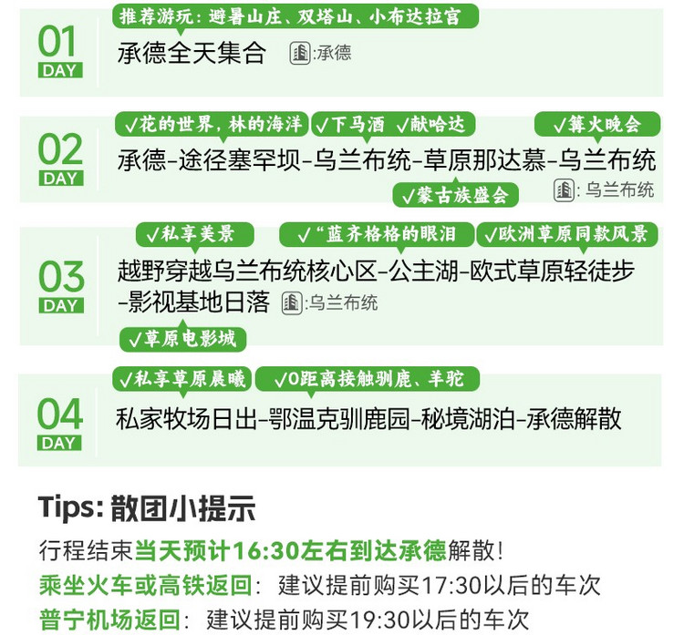 1、行程结束当天16:30左右抵达承德,大家可以依据自己的时间,自行选择继续游玩或是启程回家。乘坐火车和高铁建议购买18:30以后的车次,飞机建议购买19:30以后的航班。
