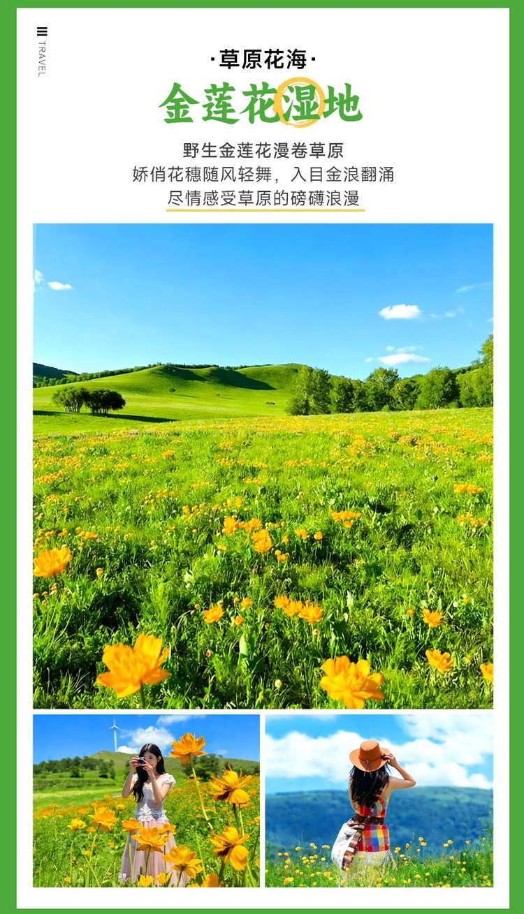 【金莲花湿地】是草原上的天然湿地,夏季时大片金莲花盛开,宛如“小火苗”点缀在绿茵茵的草地上,清新淡雅,美不胜收(*金莲花为季节性景观,以往花期为7月初到7月下旬,受天气和温度影响)。