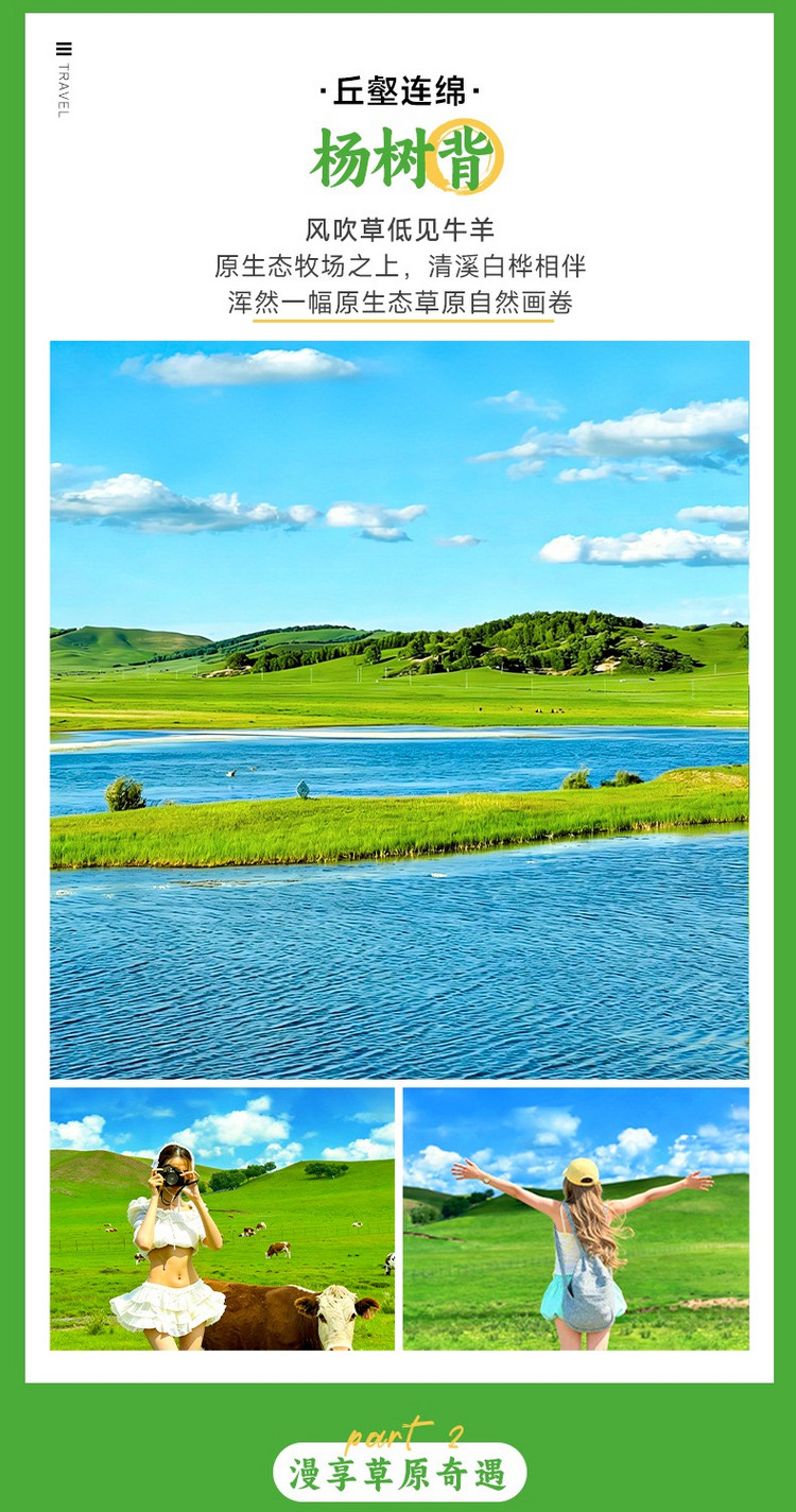 【杨树背】草原私藏的天然氧吧,挺拔的白桦林与茵茵绿草交织成画,越野车穿梭林间,颠簸又刺激;林间小松鼠灵动出没,为旅途添上几分萌趣。