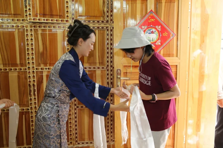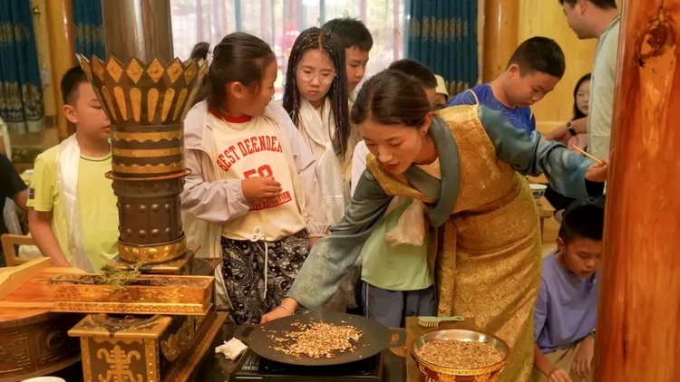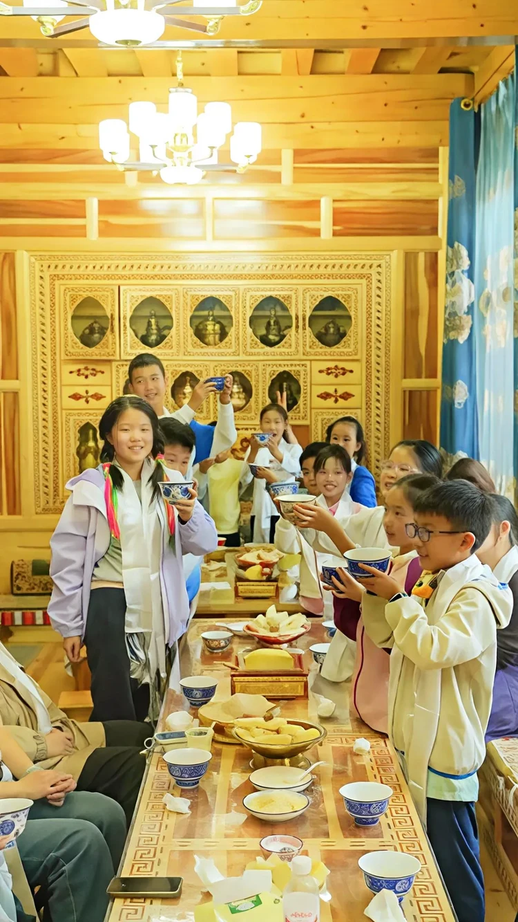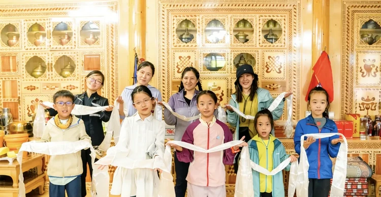 等候多时的卓玛将带领孩子们体验完整的藏家迎宾礼——松柏熏身(白塔前用柏枝轻烟净化)、净手(山泉水濯洗双手)、献哈达(蓝色的哈达献给远方的朋友)。