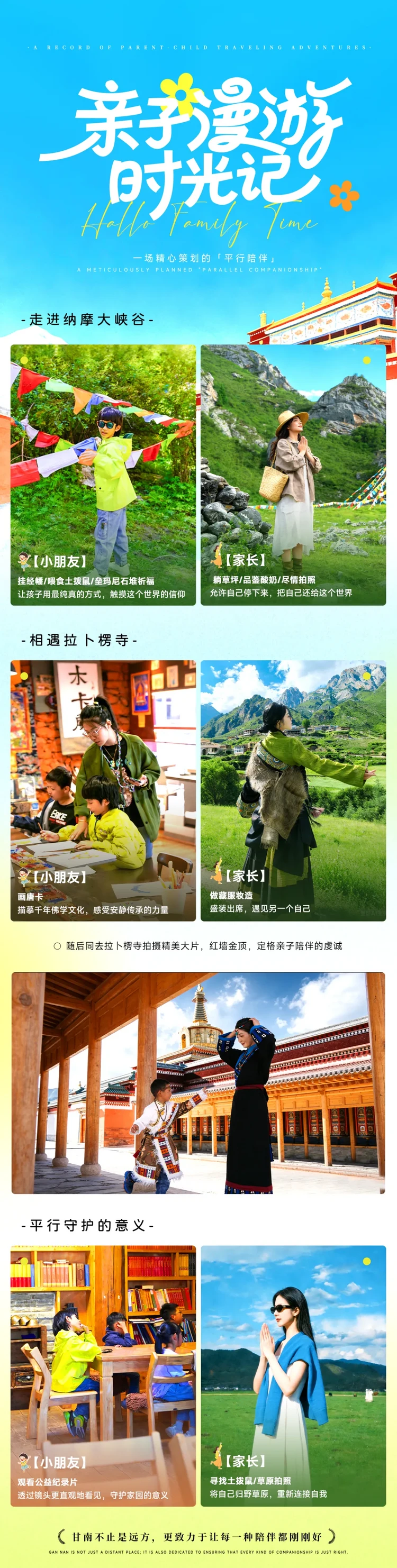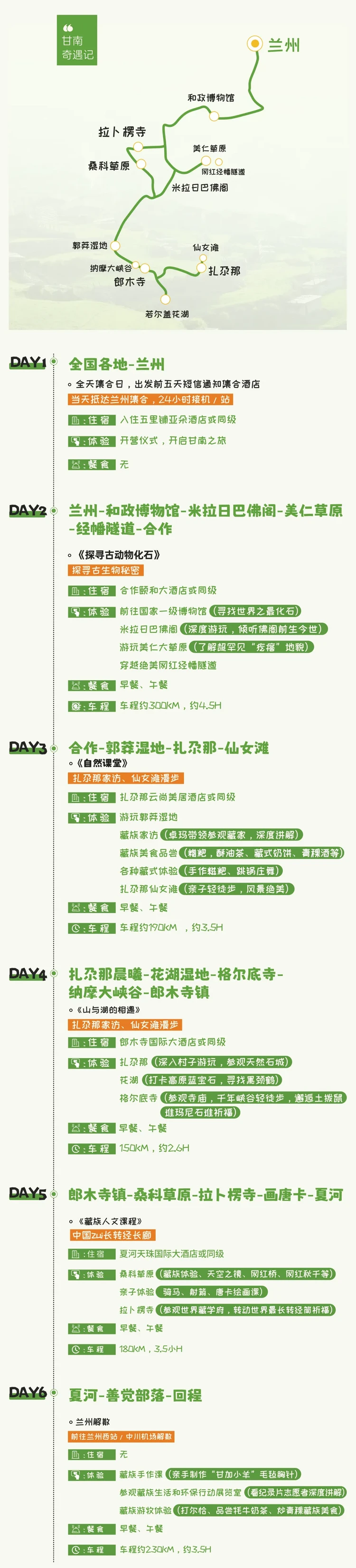今天为全天集合日,我们相聚在兰州,出发前五天短信通知集合酒店。领队会在出发前一天下午18:00前联系您。到达酒店报【遇见甘南亲子营+姓名】入住酒店。待入住整理完毕,将会为大家举办一场【开营仪式】,邀请大家共同分享交流,正式开启咱们的甘南亲子之旅。
