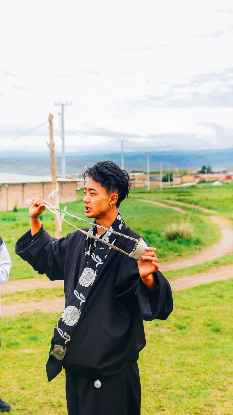 挑战藏族牧人的必修技能——打尔恰,学习如何把石子包裹在绳兜里,抡圆、松手,石子呼啸而出。能打到10米外靶心的孩子,会被部落授予“小牧人”称号。
