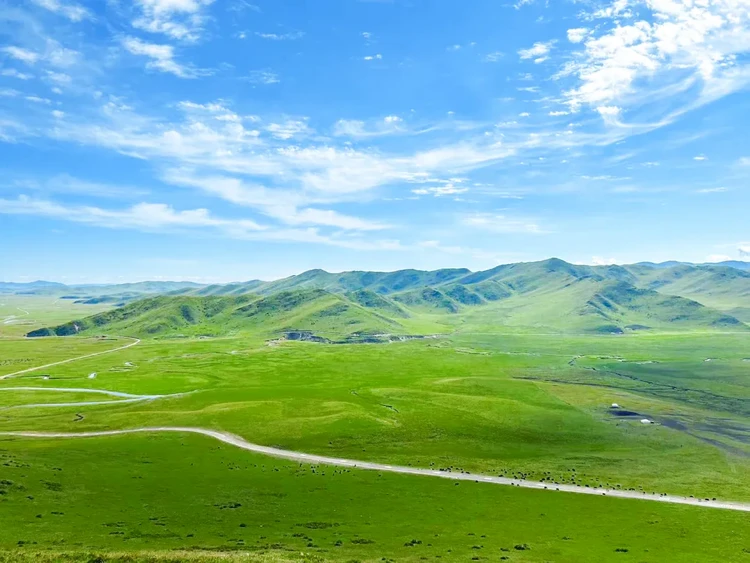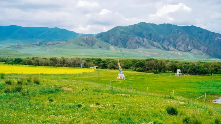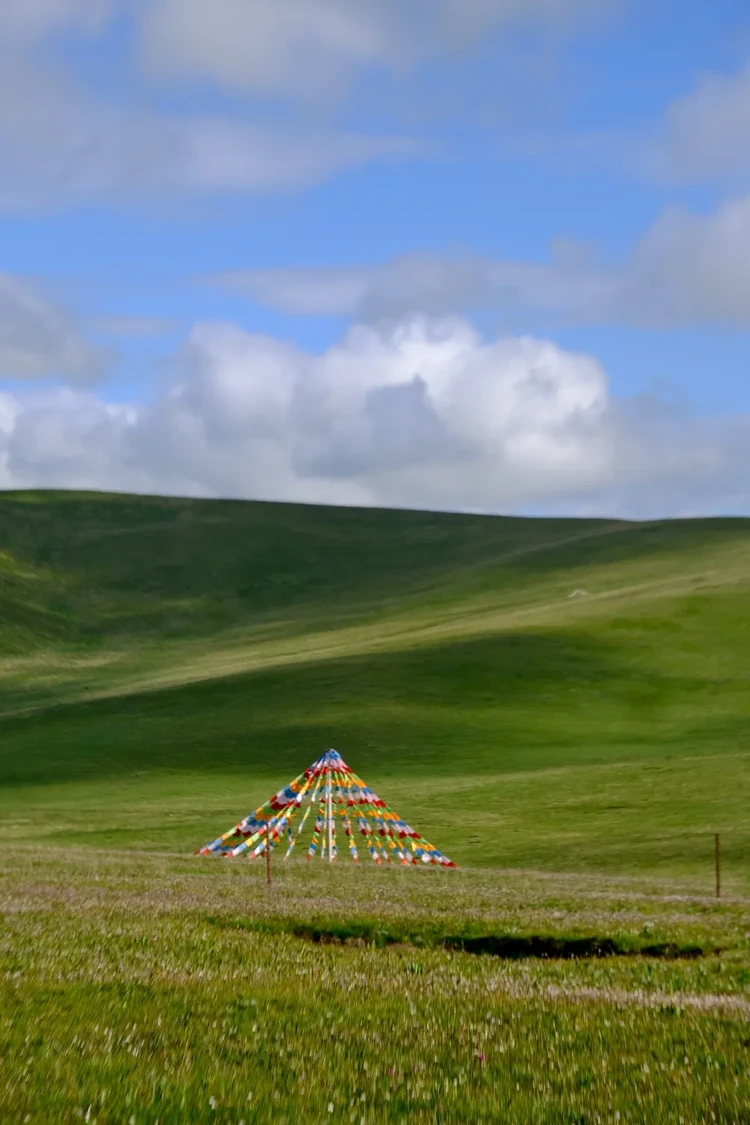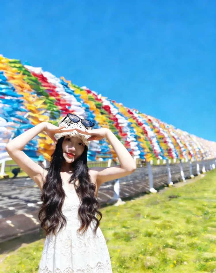 参观完这座神秘的佛阁后前往【美仁大草原】,这里的草原不是一马平川,而是布满成千上万个隆起的小草墩,一路风景如画,牛羊成群悠闲自得。草原上矗立着长达600米的网红经幡隧道——五彩经幡在头顶编织成一条绵延数公里的彩虹长廊,风过处,十万遍经文被诵向苍穹。我们将穿越其中,让风马旗在头顶猎猎作响,拍照非常出片。