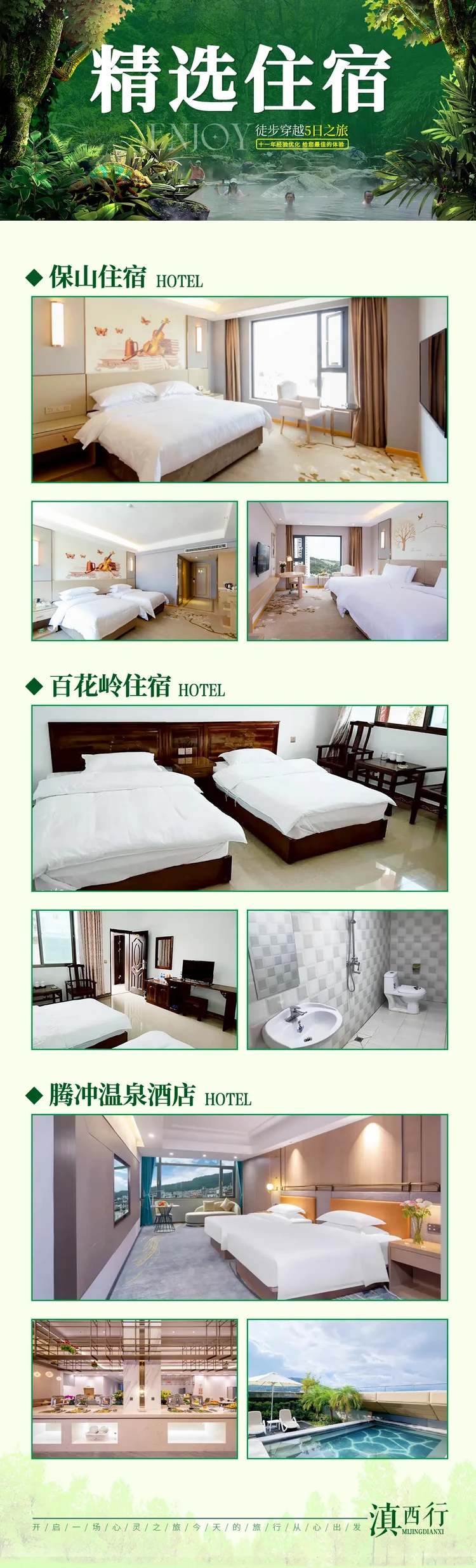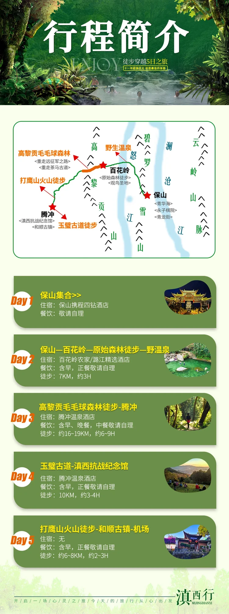 4、如果遇到百花岭景区封闭,我们会将行程调整为【保山-高黎贡山秘境徒步-野温泉】,徒步约7-9KM,景观、体验和百花岭类似,住宿地点随之调整;