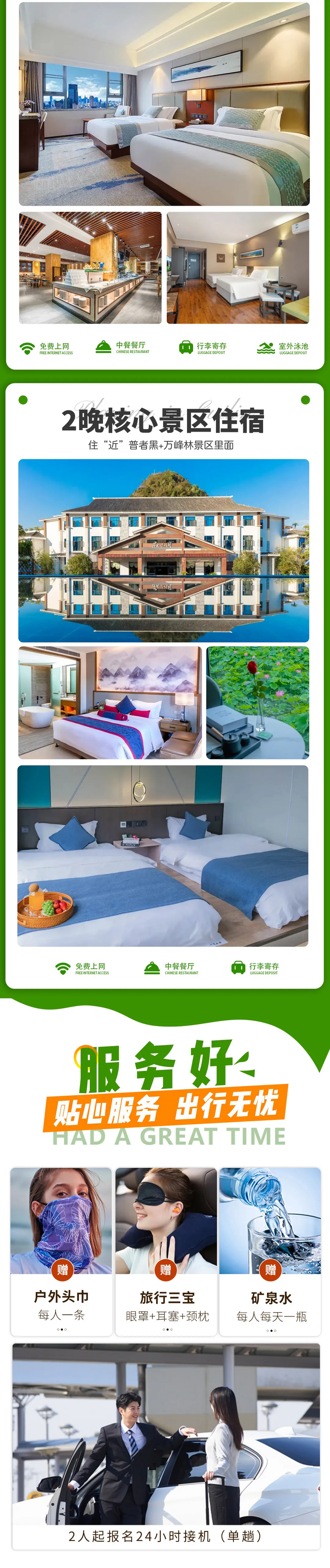 用餐:含早,中餐(中餐为景区赠送项目,满4人赠送,需服从景区餐厅安排),晚餐自理