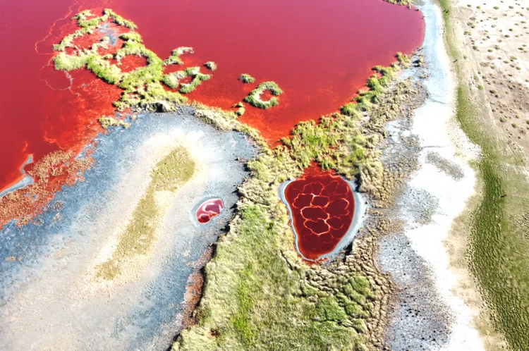 乌兰湖,是藏在腾格里沙漠腹地的红色心脏,以极致的色彩和形态震撼人心,被金黄沙丘、银白盐滩、浅绿芦苇环绕,对比强烈。