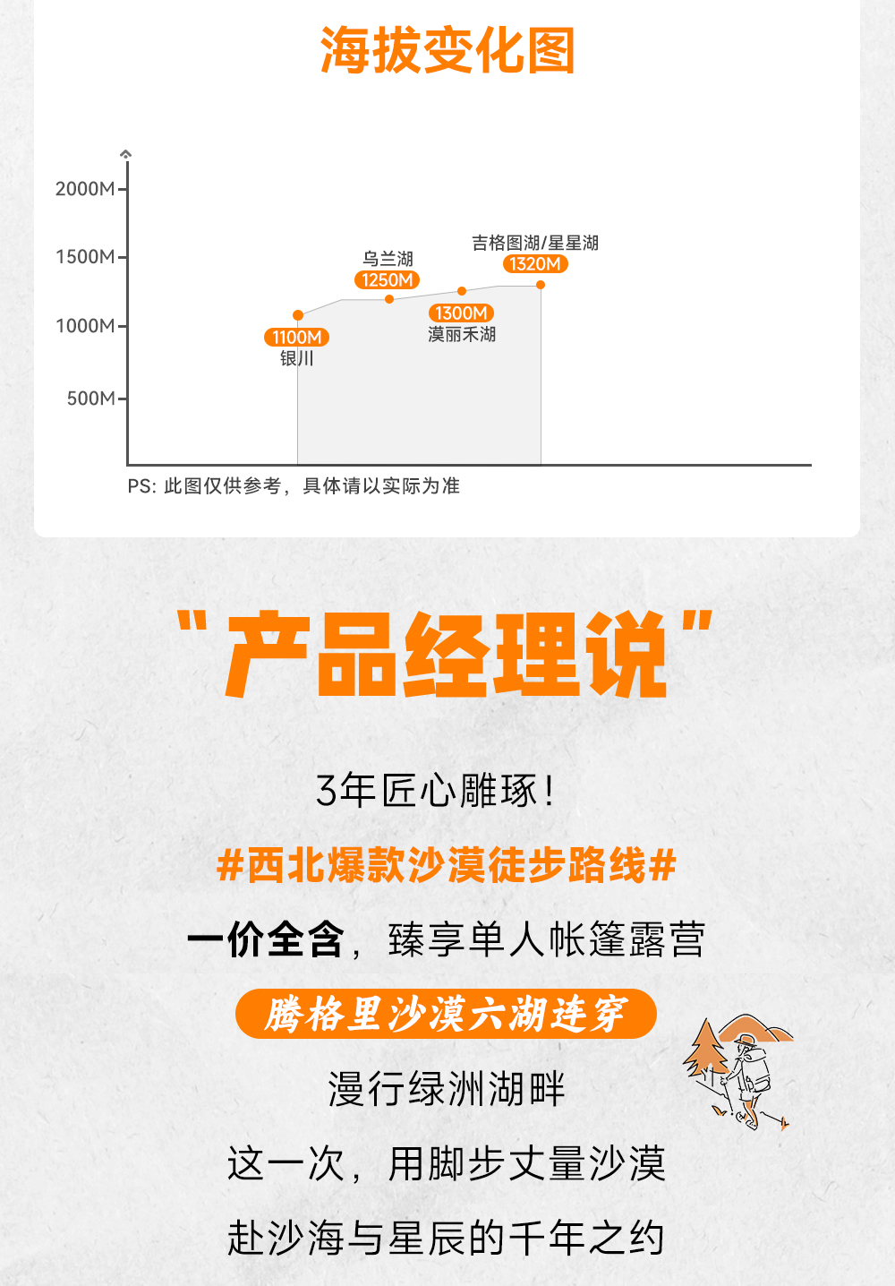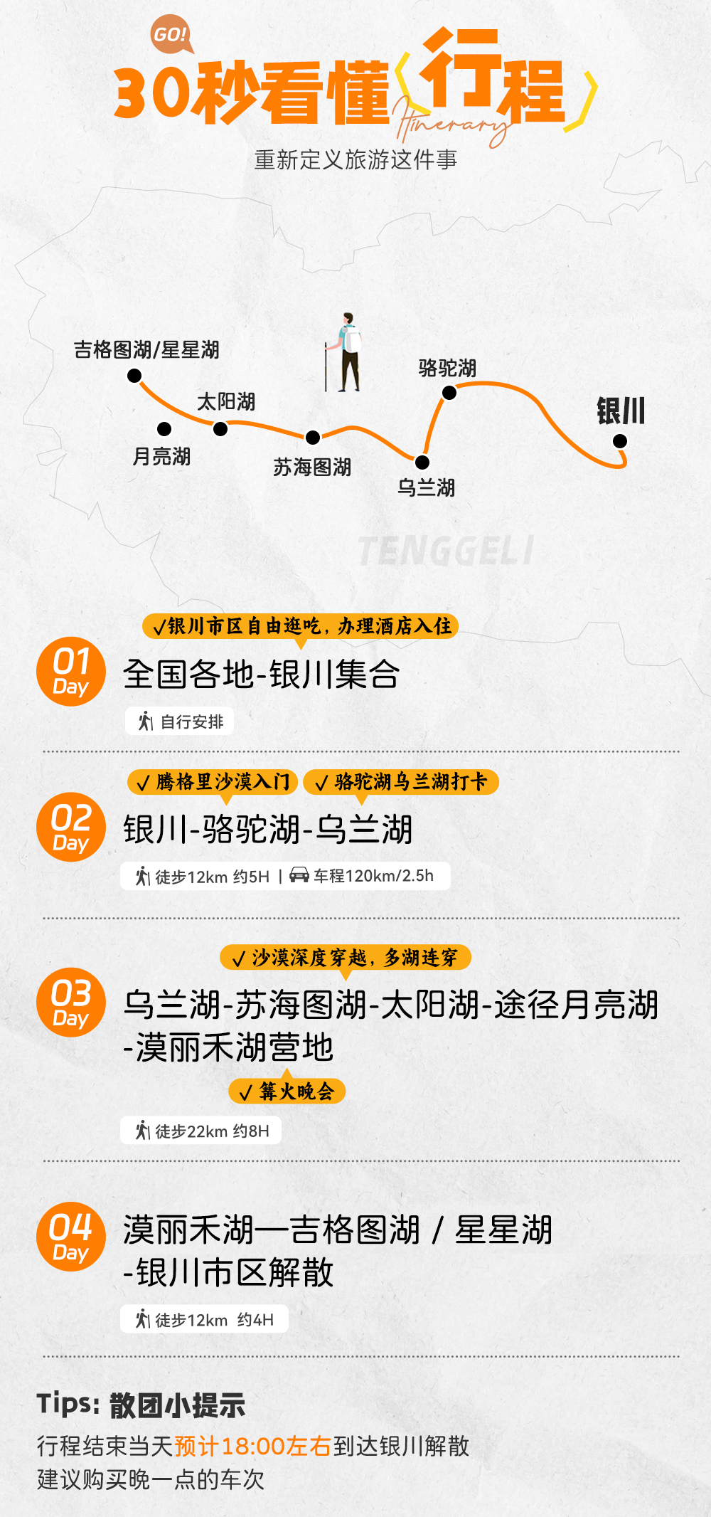 上午11:00左右我们抵达徒步起点,分发沙套、魔术头巾、登山杖等物资,之后跟随领队在沙漠徒步起点处开始做热身运动,今日徒步全天行程12公里,匀速6小时左右即可到达营地,夜宿乌兰湖营地。