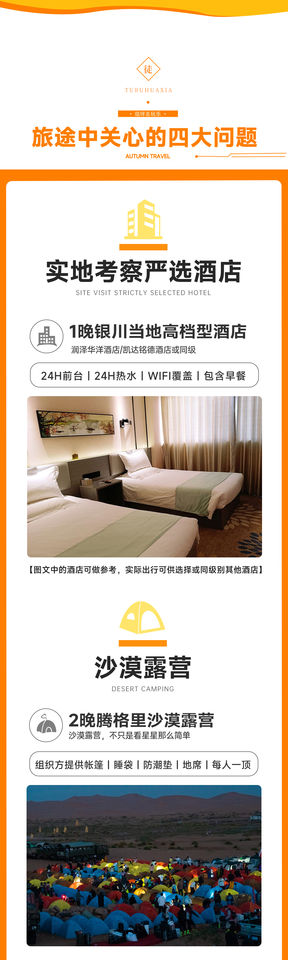 今天是活动集合日,来自全国的队友抵达银川后,前往指定酒店报【徒步华夏+姓名】办理入住。如您抵达时间尚早,可自行前往以下推荐的精华景点游览和美食品尝。领队今日会提前通知行前会的时间和地点,针对未来3天的沙漠徒步宣讲活动日程、安全注意事项。